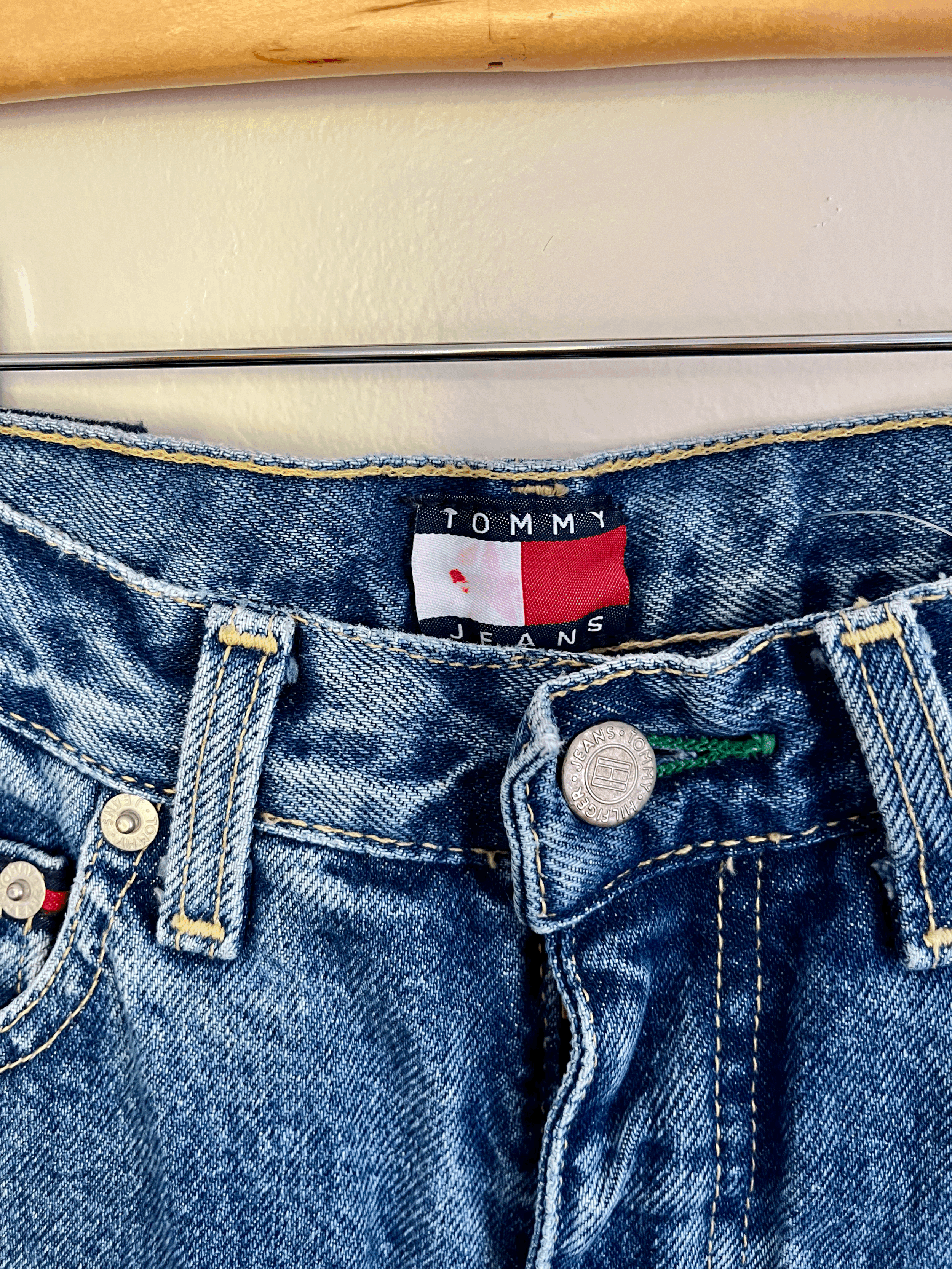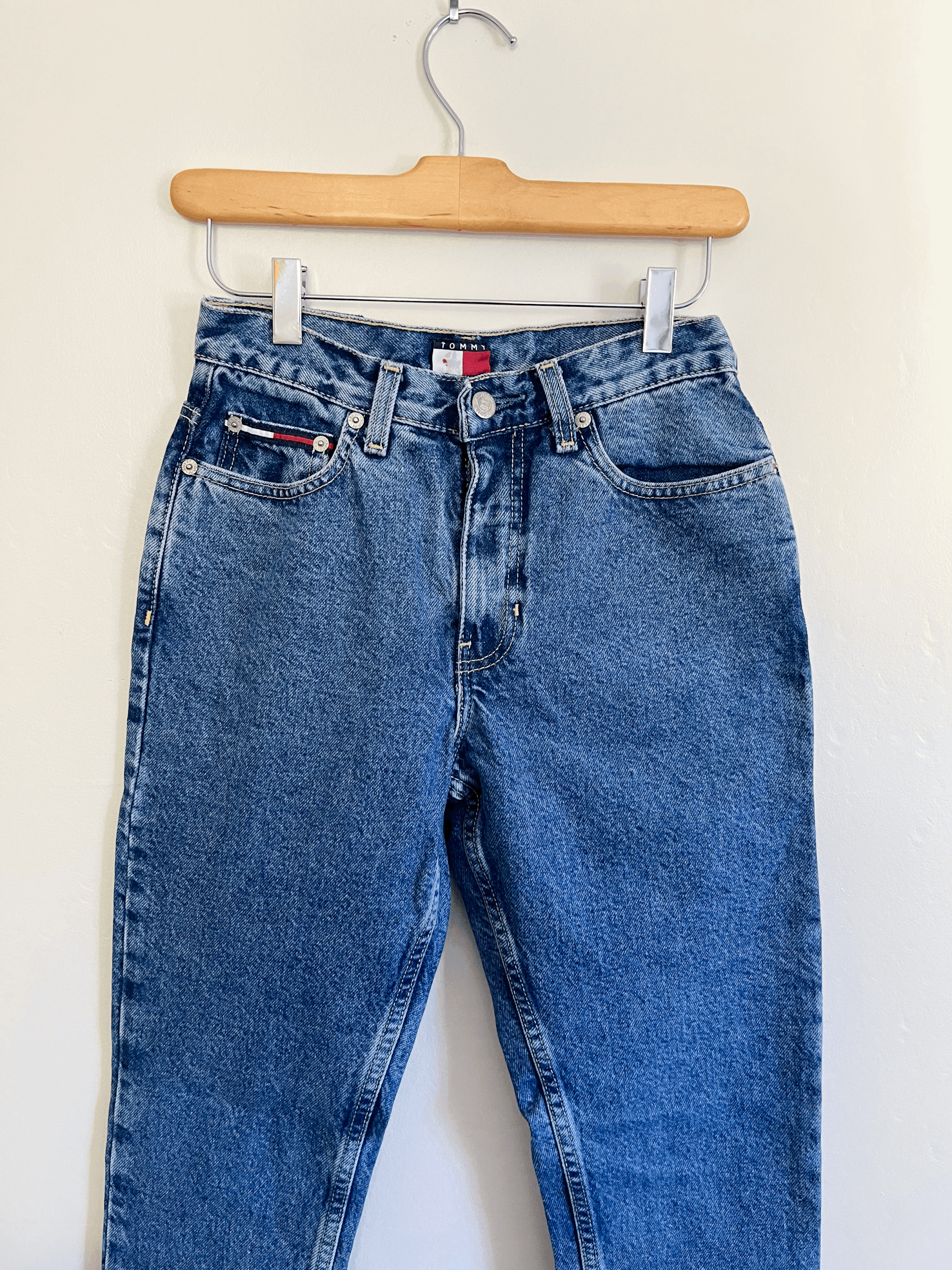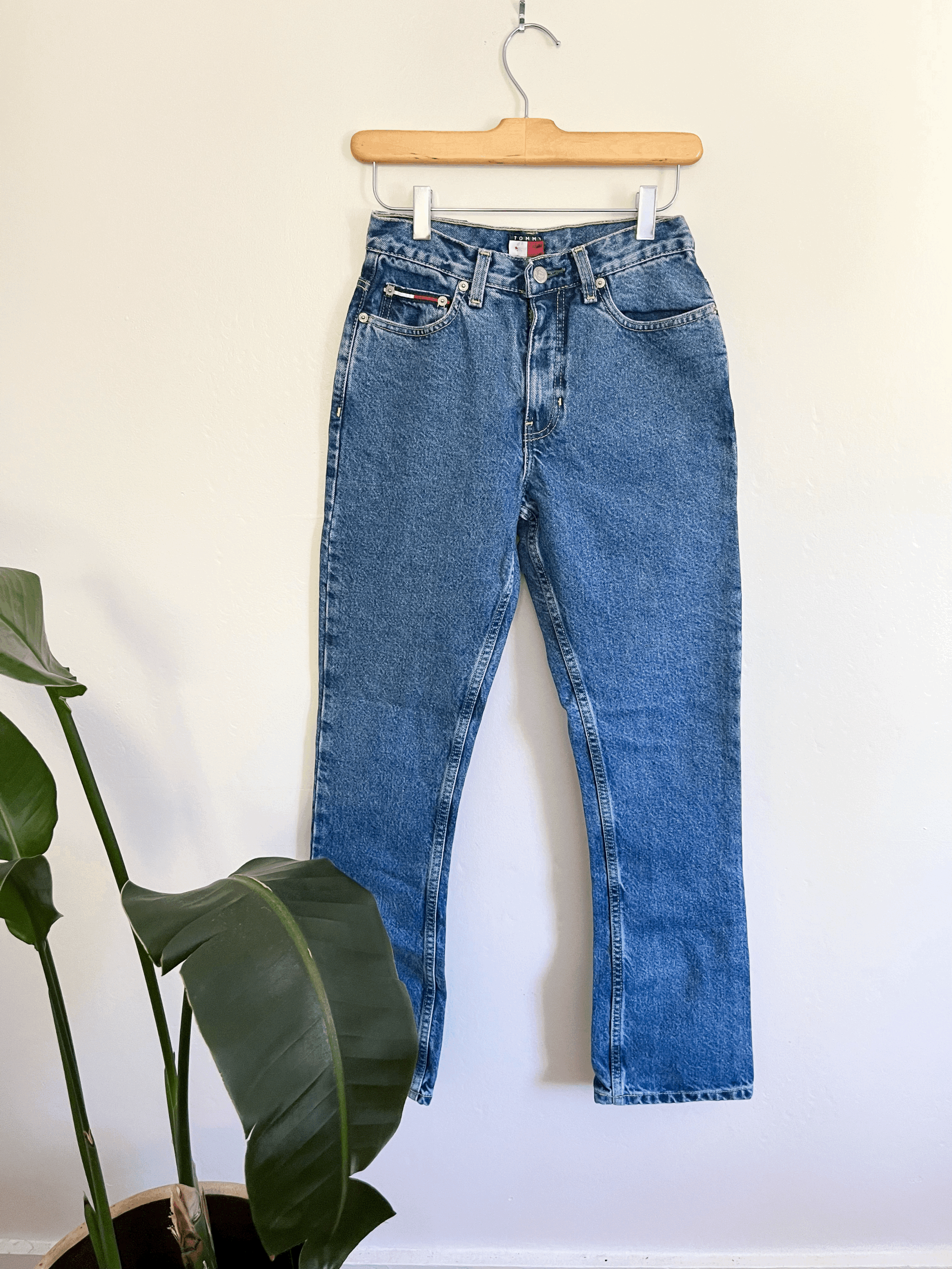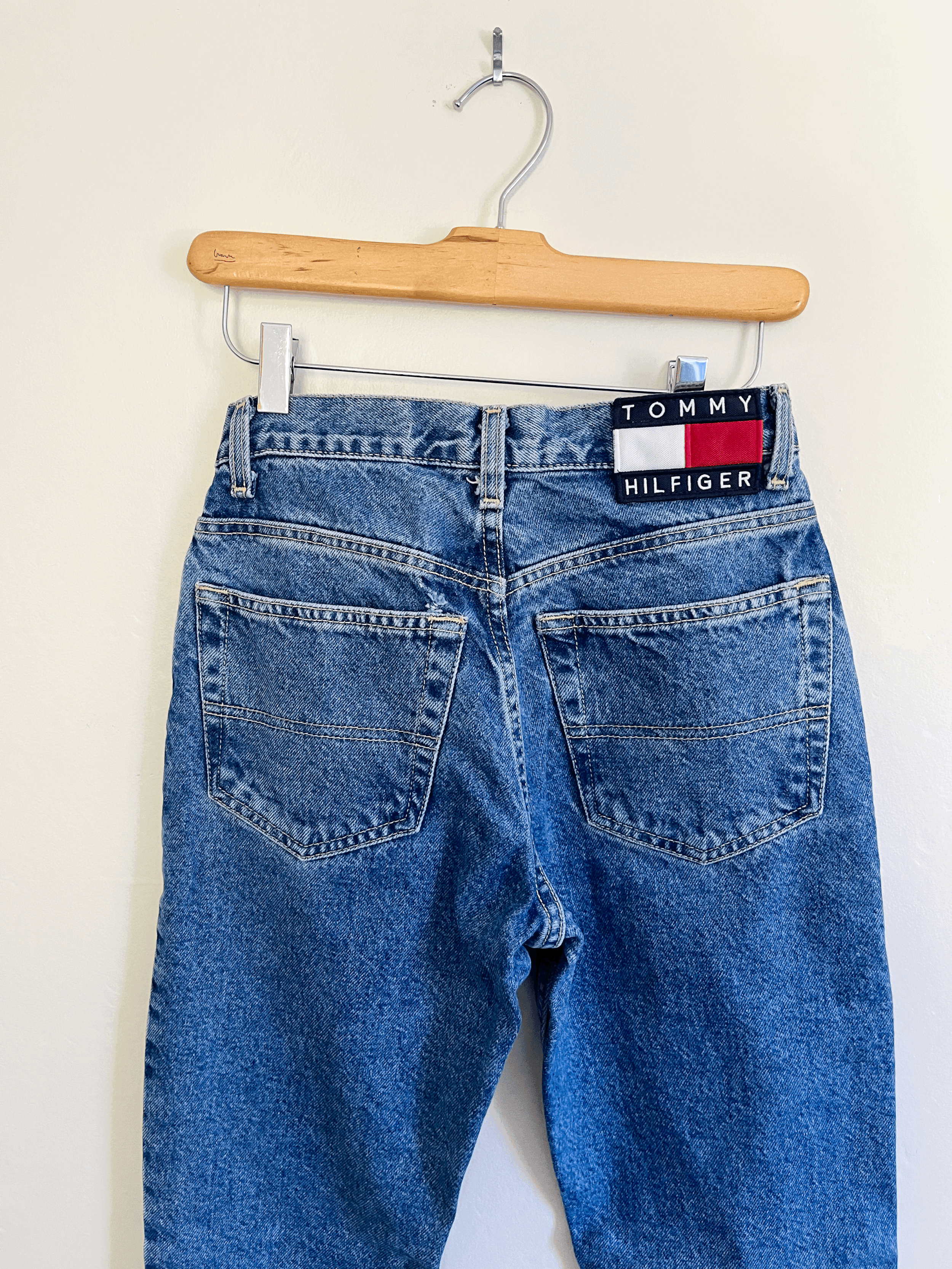 Vintage 1990s Old Navy blue jeans cropped capri pants with a low-rise fit. Features zipper fly and pink paisley cuffed legs. Made from 100% cotton and in good condition.