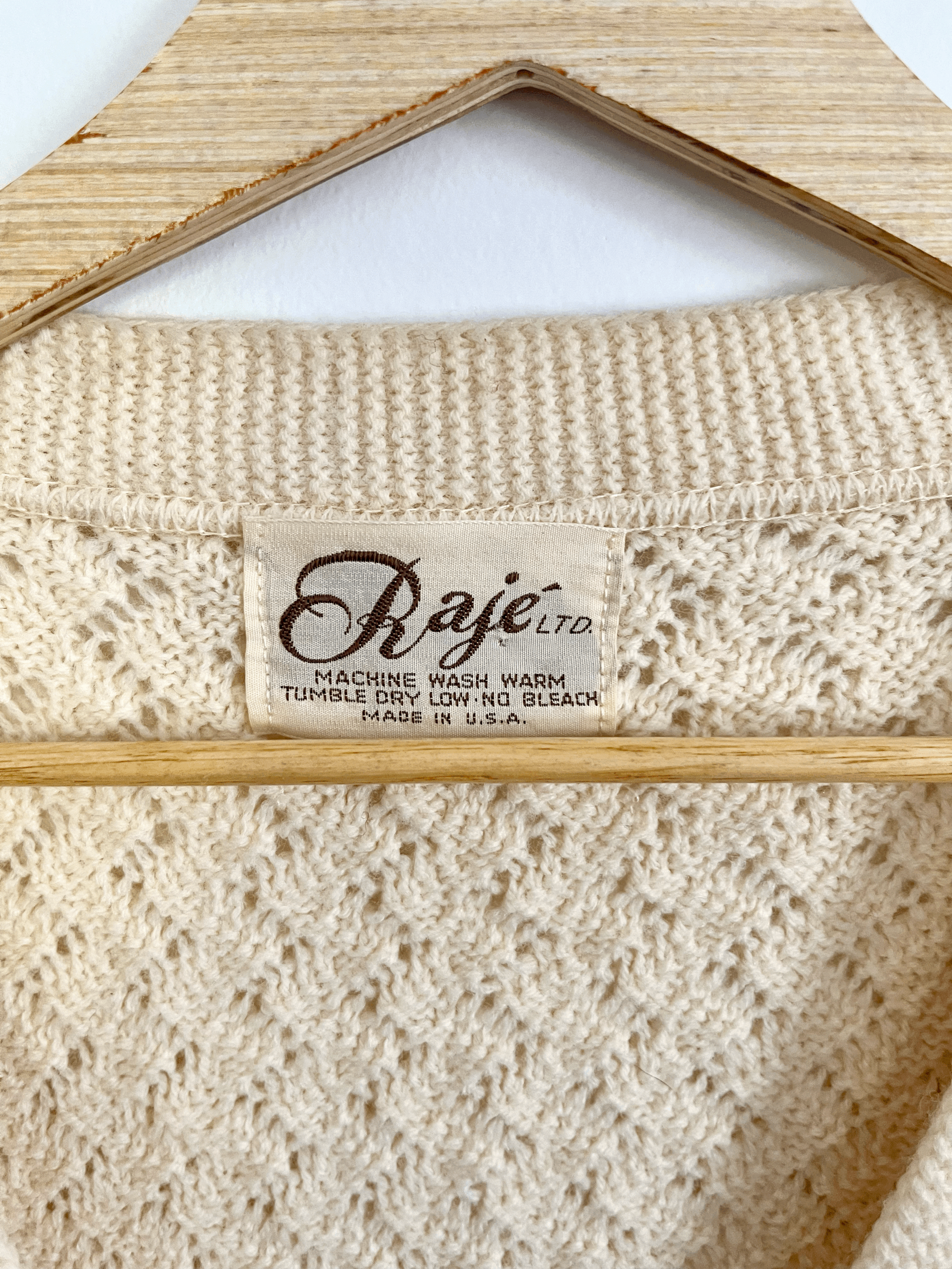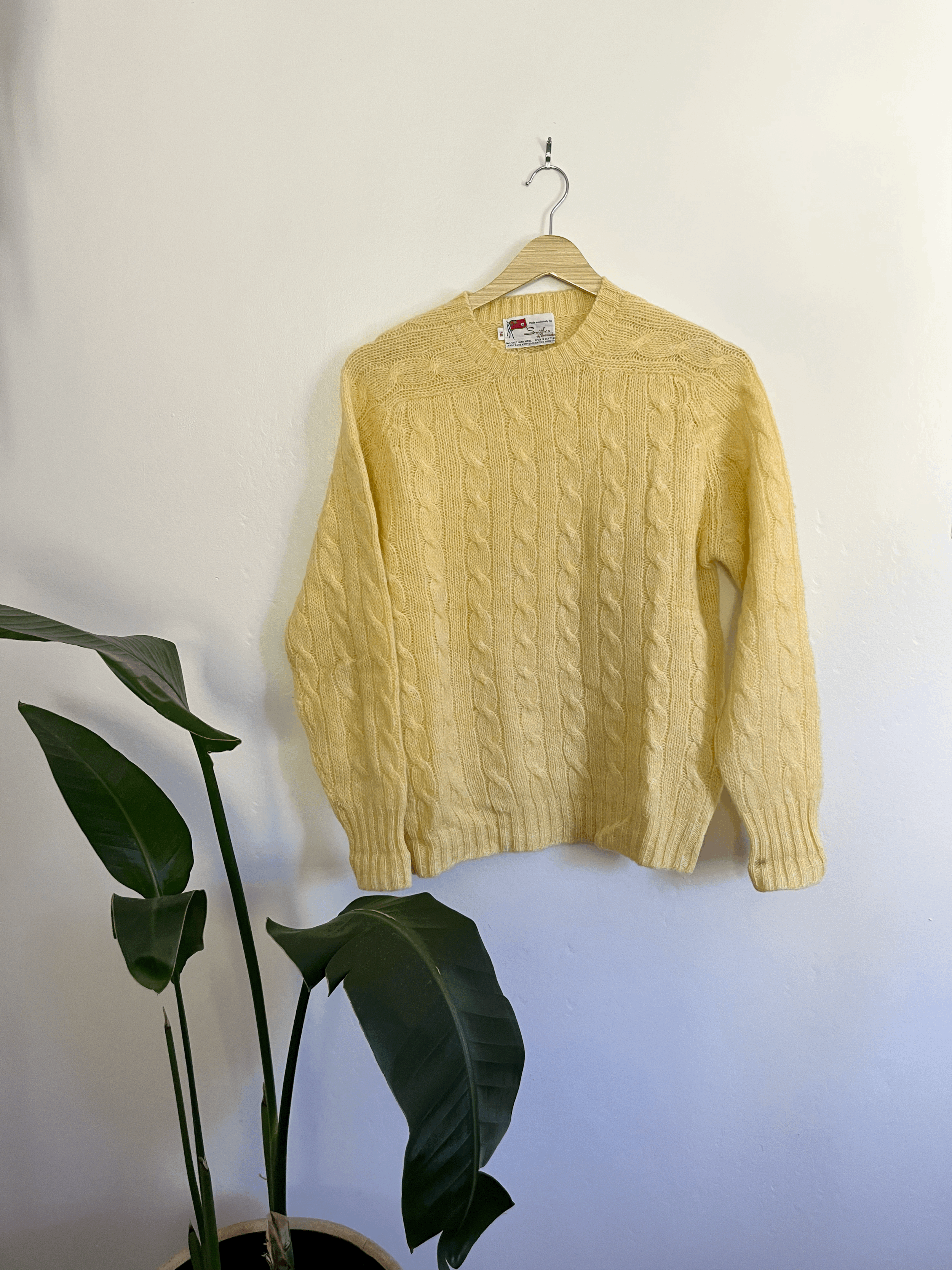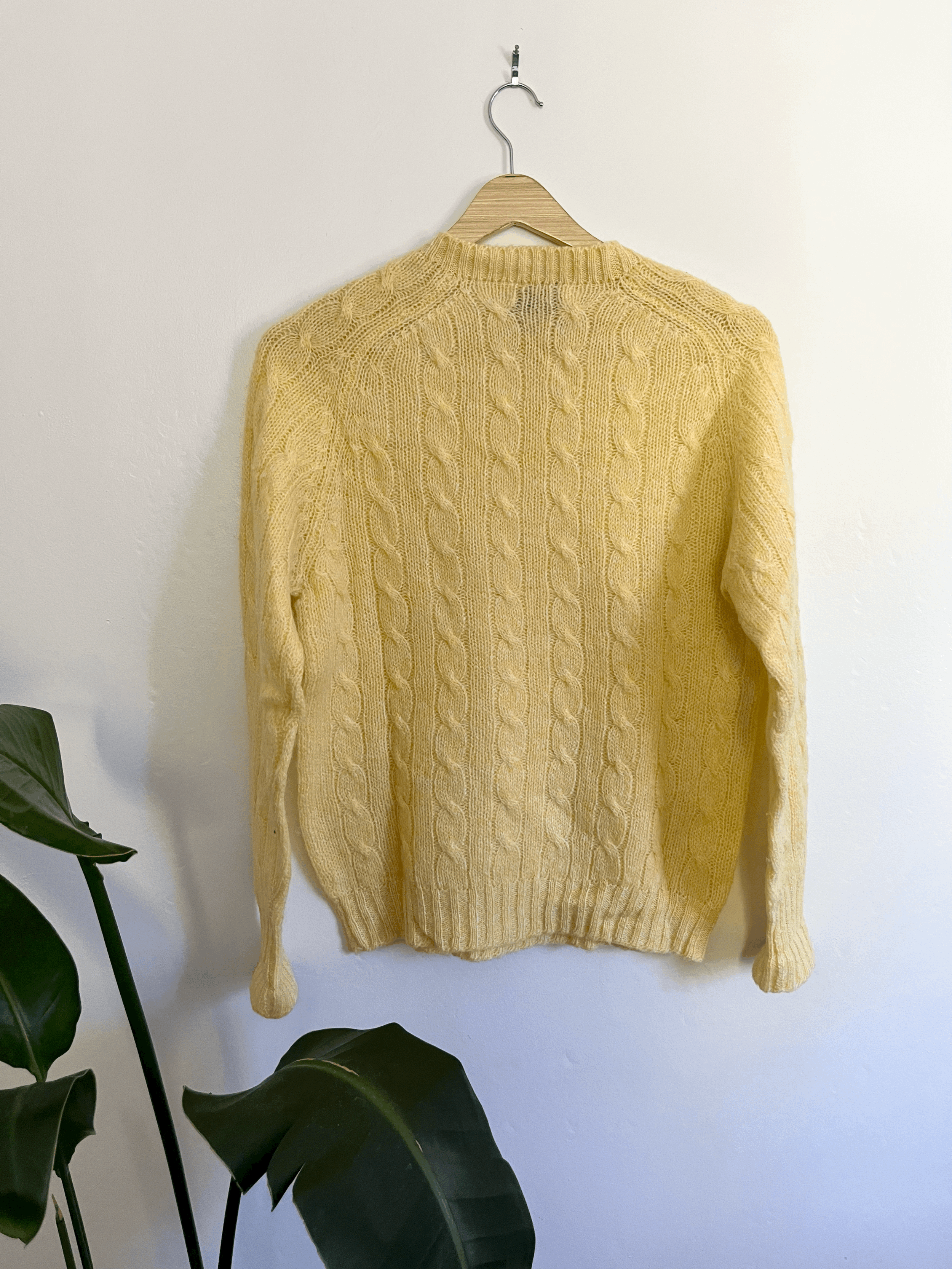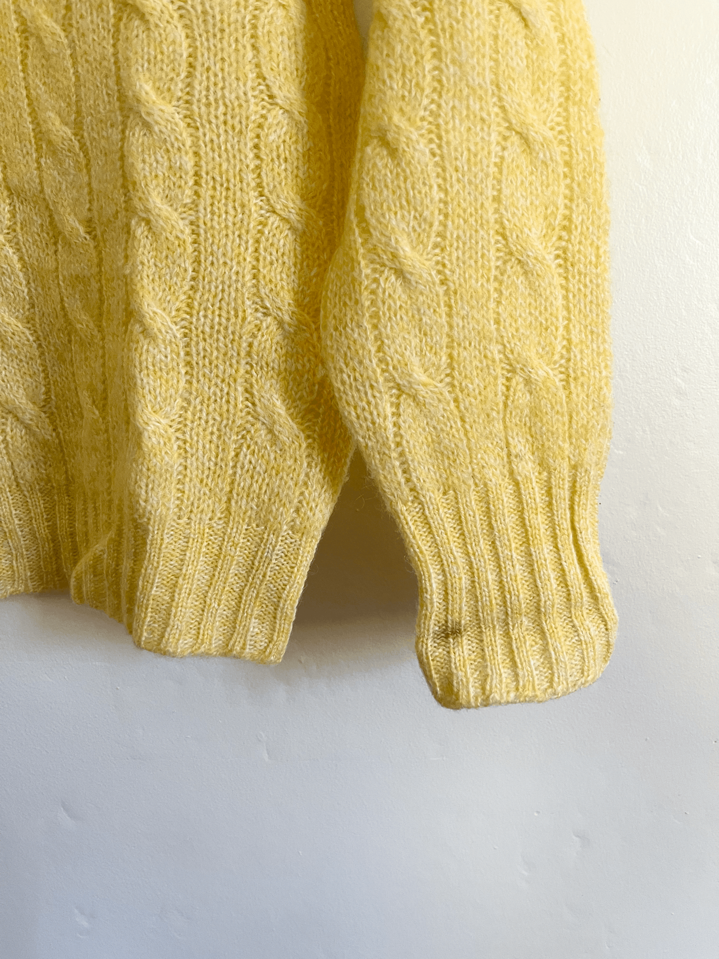 Vintage cream cable knit chunky wool sweater with a V-neck. Made from 100% wool by J. Crew. Features holes throughout, stains and browning, and a scratchy texture.