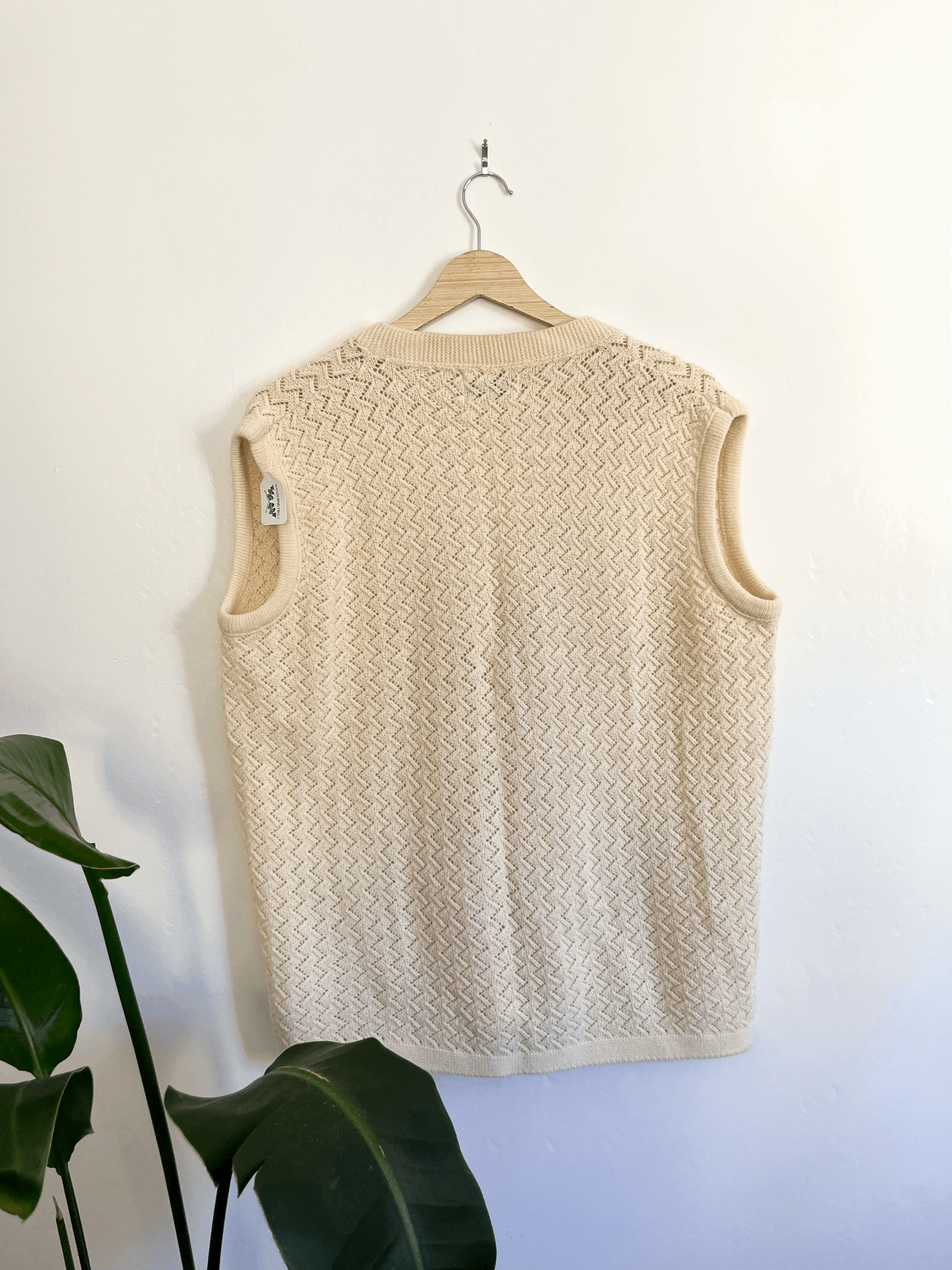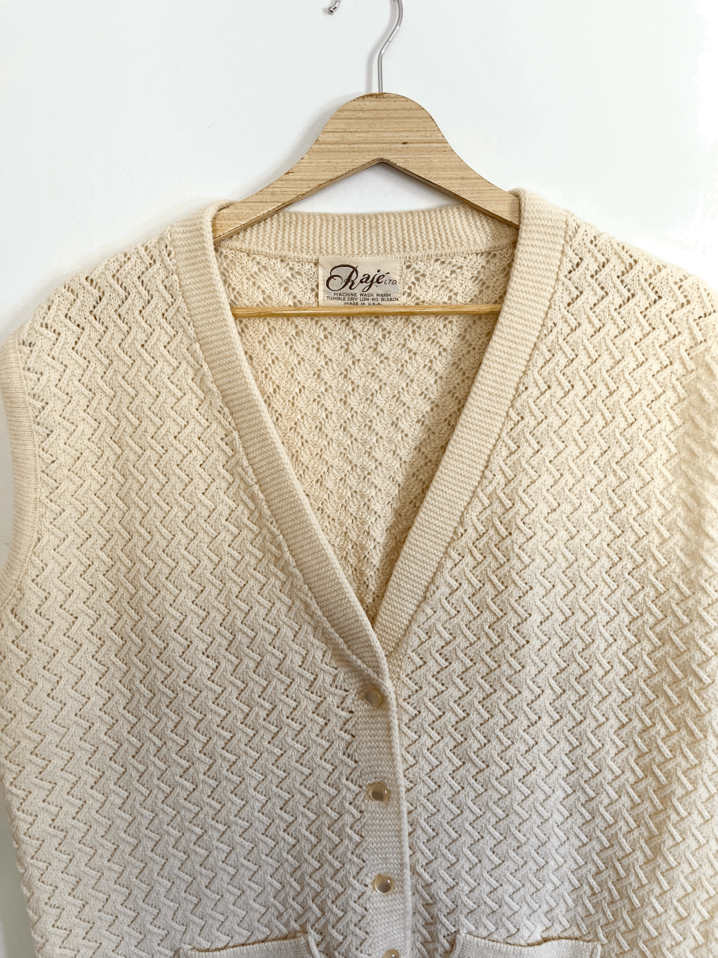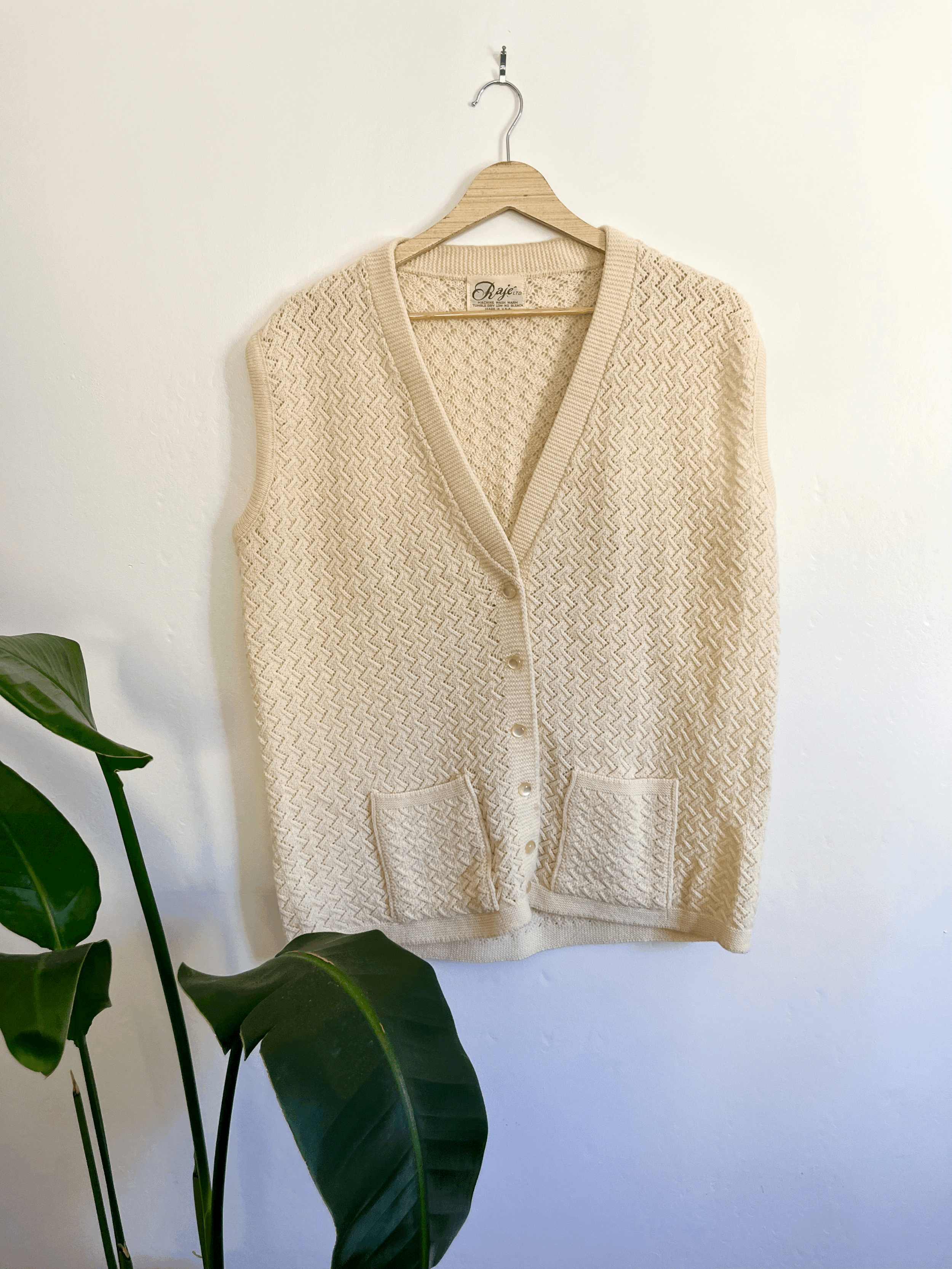 Vintage cream cable knit chunky wool sweater with a V-neck. Made from 100% wool by J. Crew. Features holes throughout, stains and browning, and a scratchy texture.