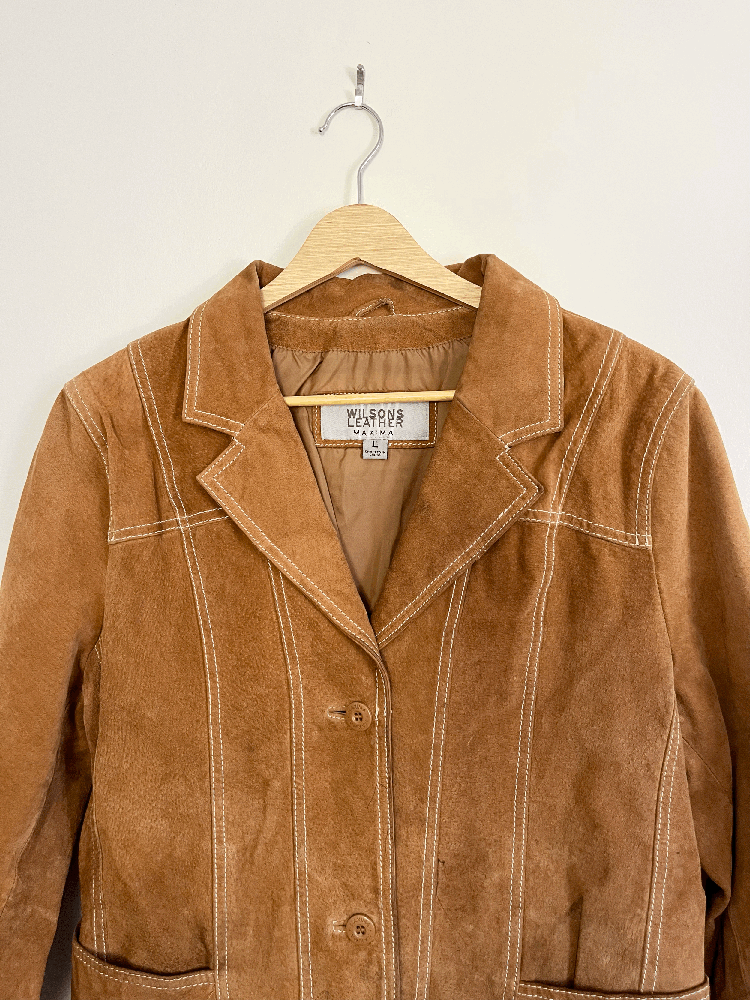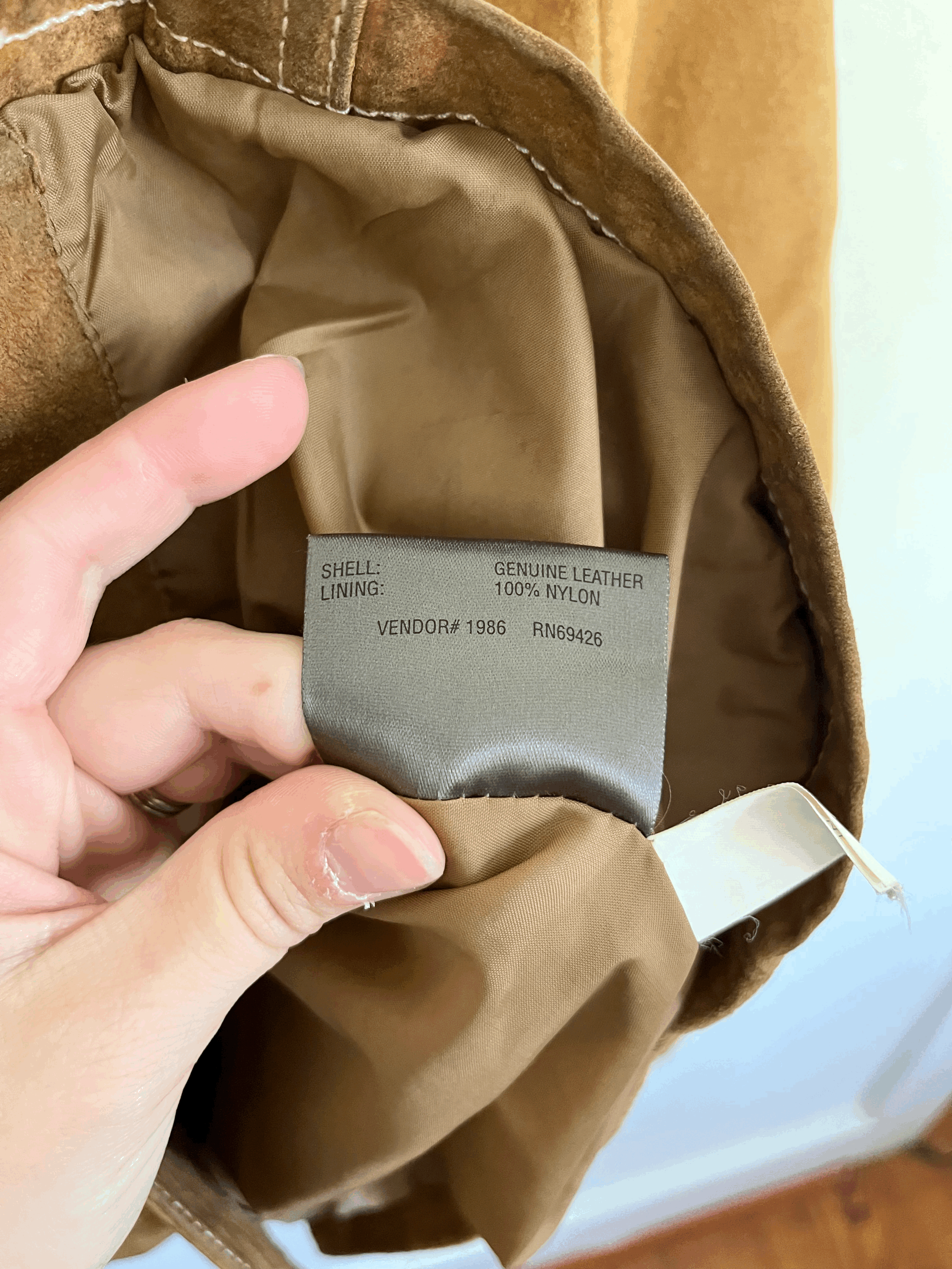 Vintage brown and orange thick faux leather sherpa vest in a Western style. Features a cream thick sherpa lining, copper button closure, and two front pockets. Staining and discoloration throughout. Made in the USA. Wrangler brand.