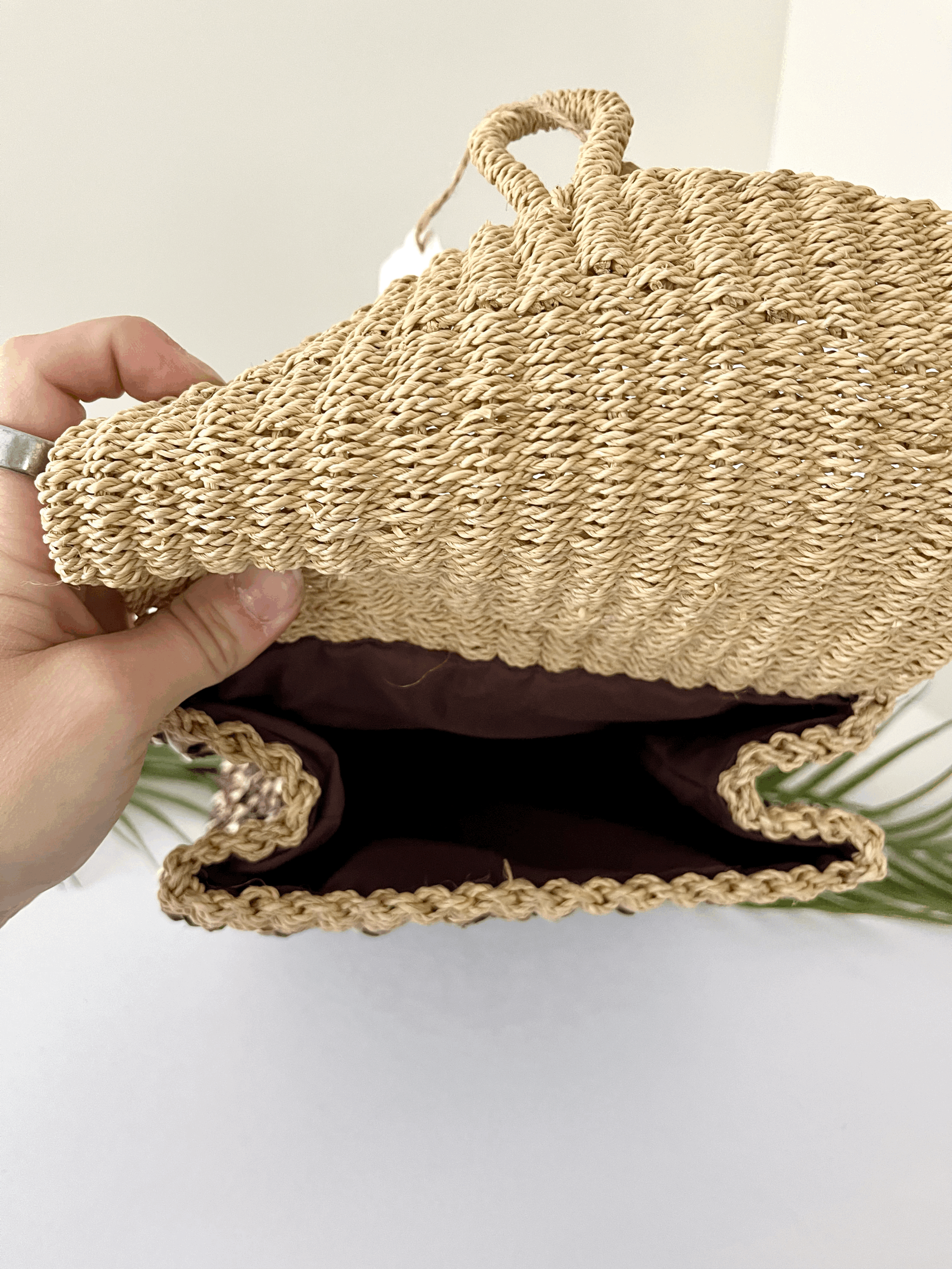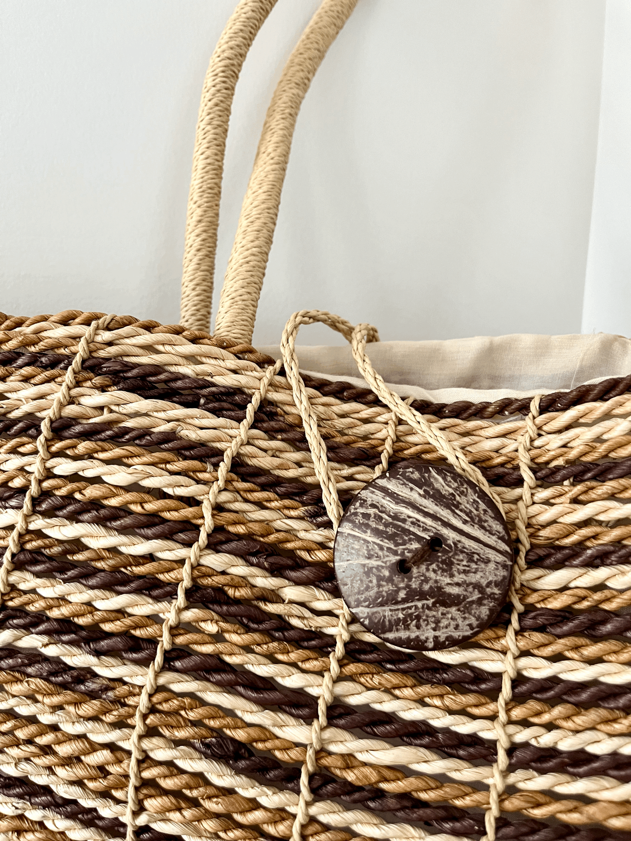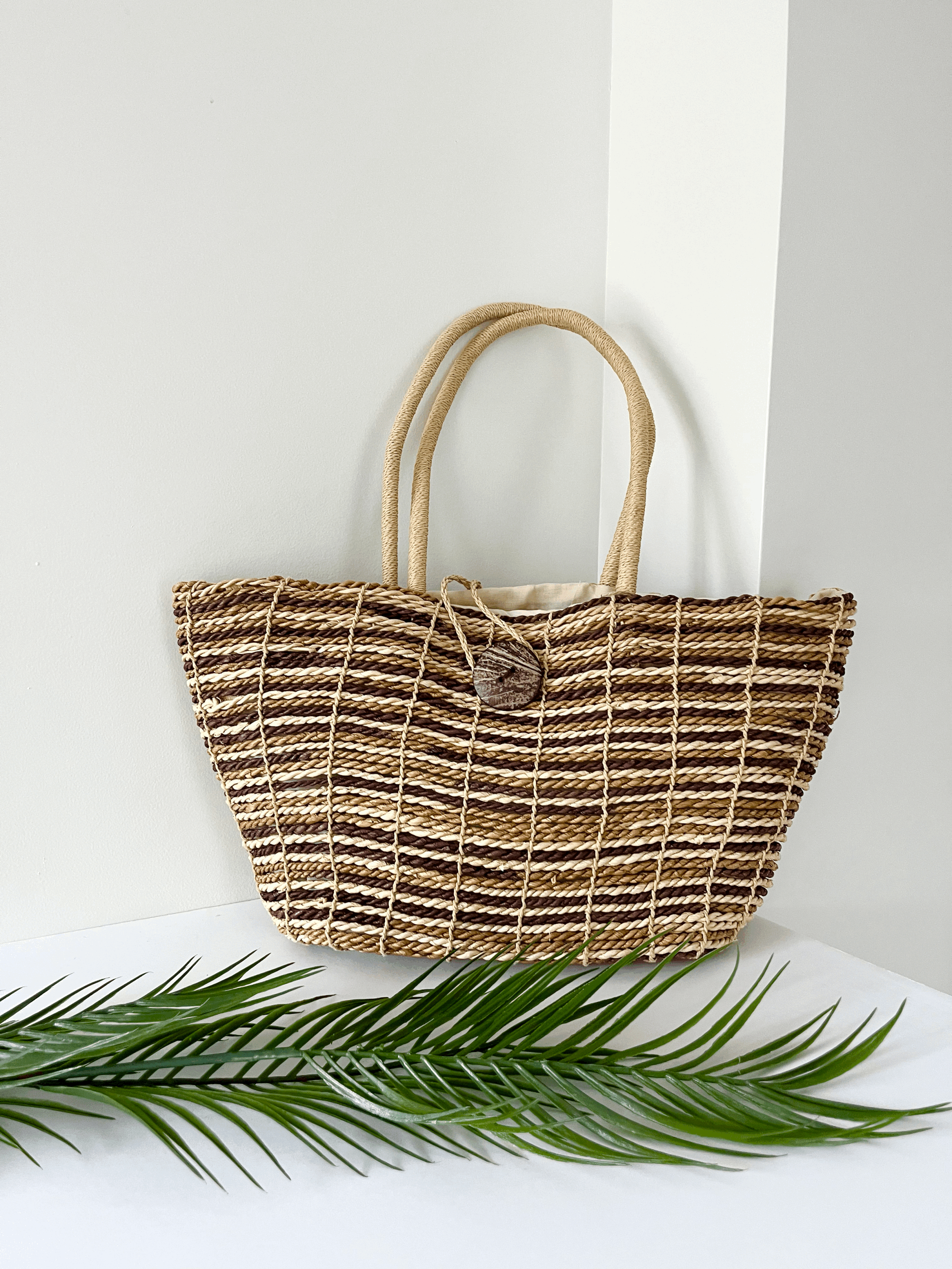 Vintage jute straw woven striped purse. Features braided straps, shell accents, a leather rim, and a zipper closure. Shows some minor unravelling, consistent with vintage use.