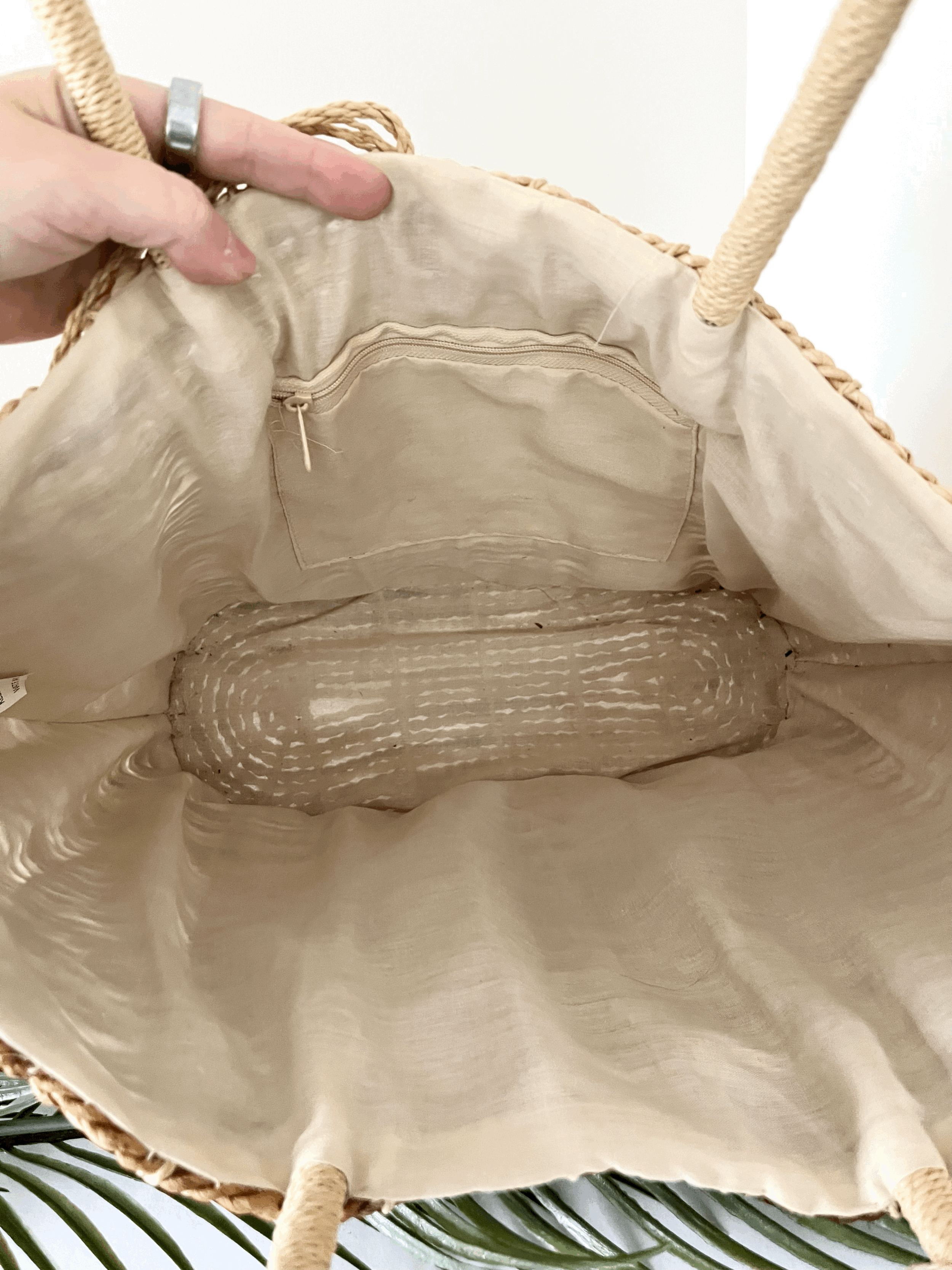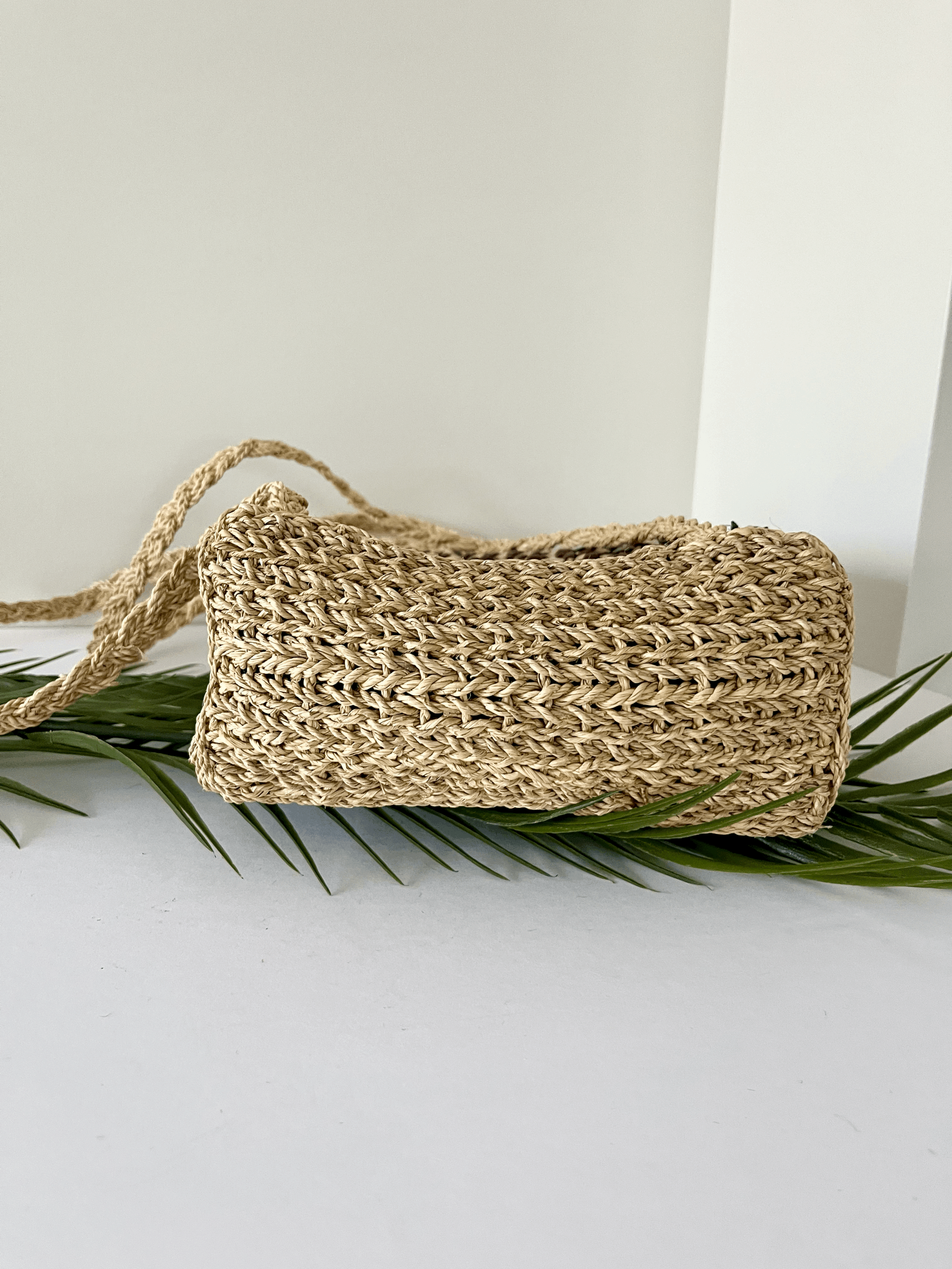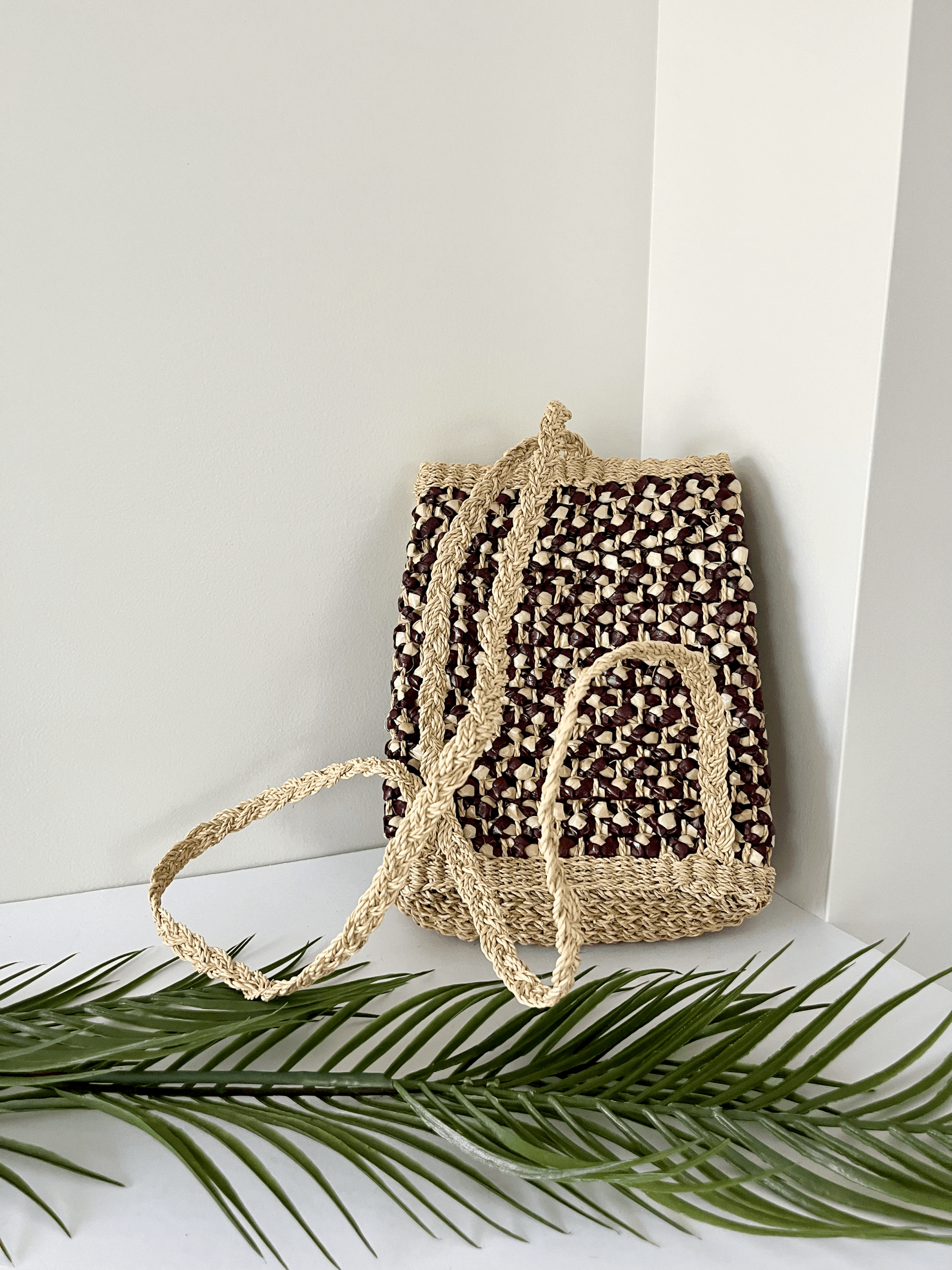 Vintage jute straw woven striped purse. Features braided straps, shell accents, a leather rim, and a zipper closure. Shows some minor unravelling, consistent with vintage use.