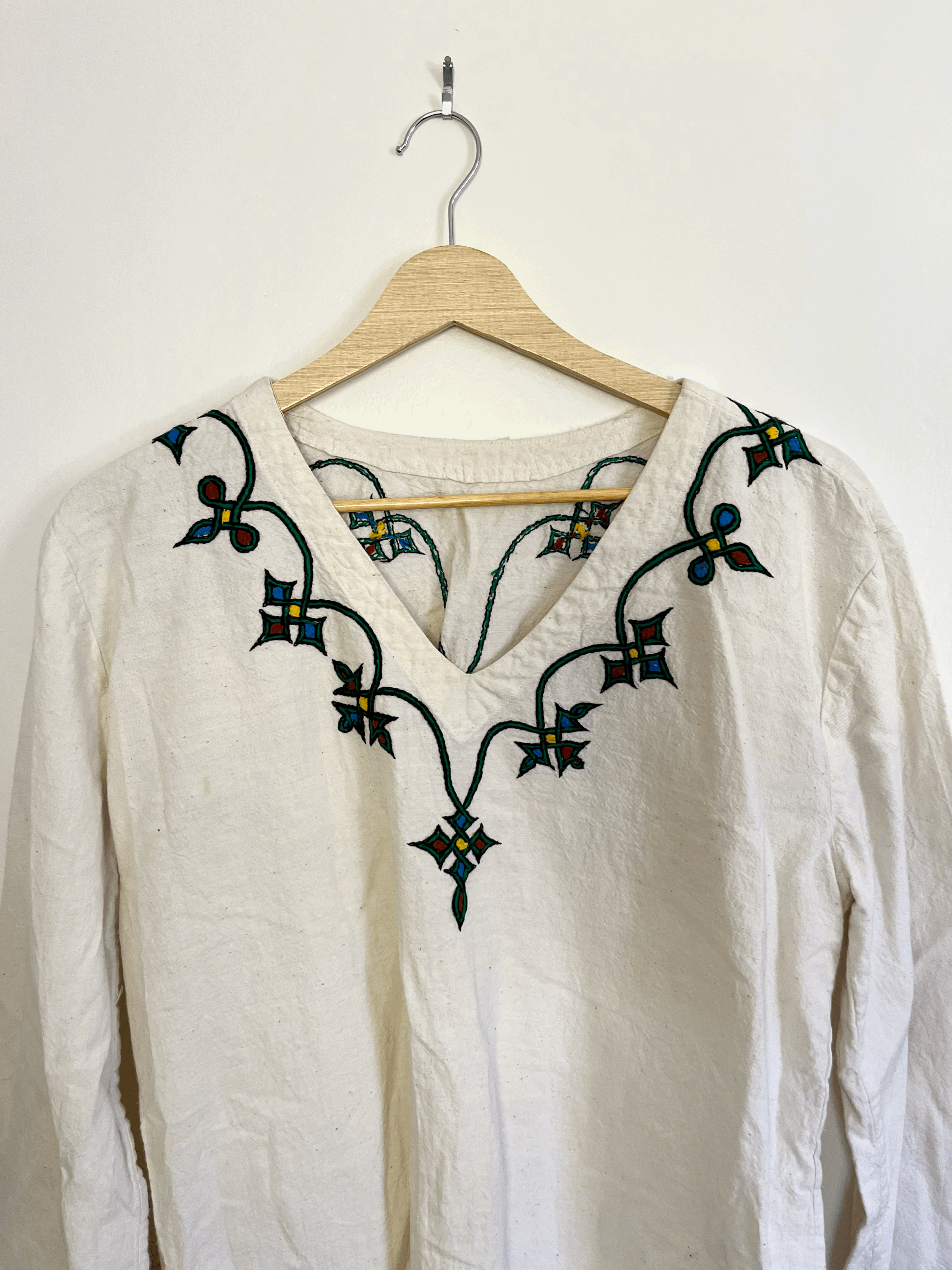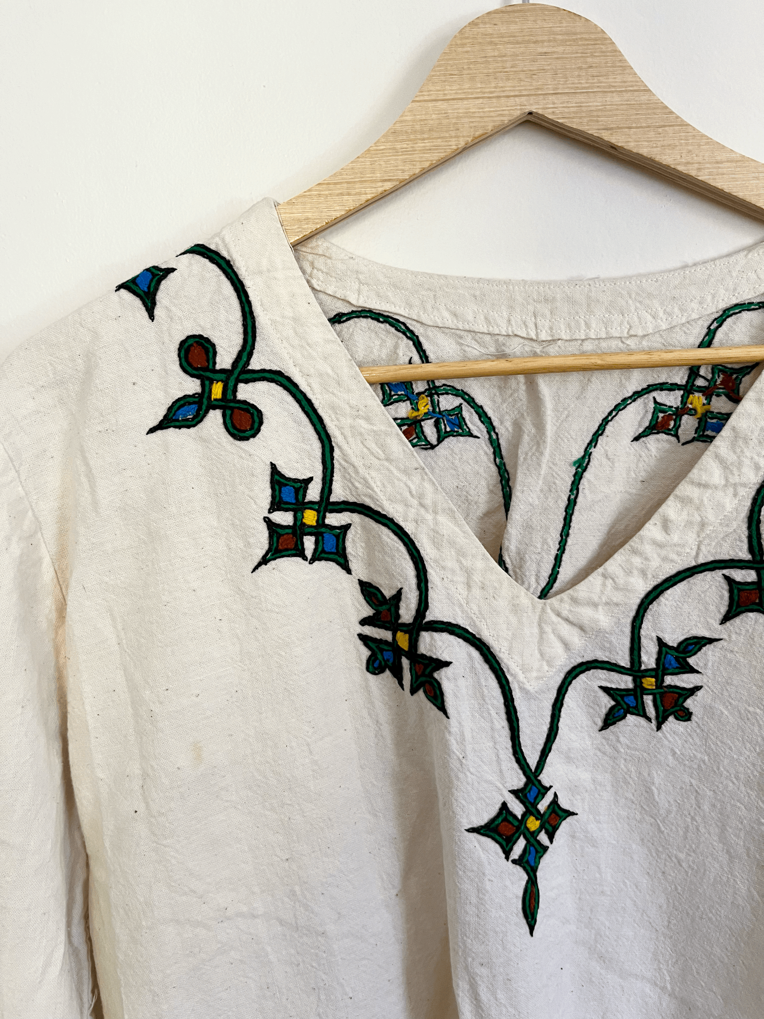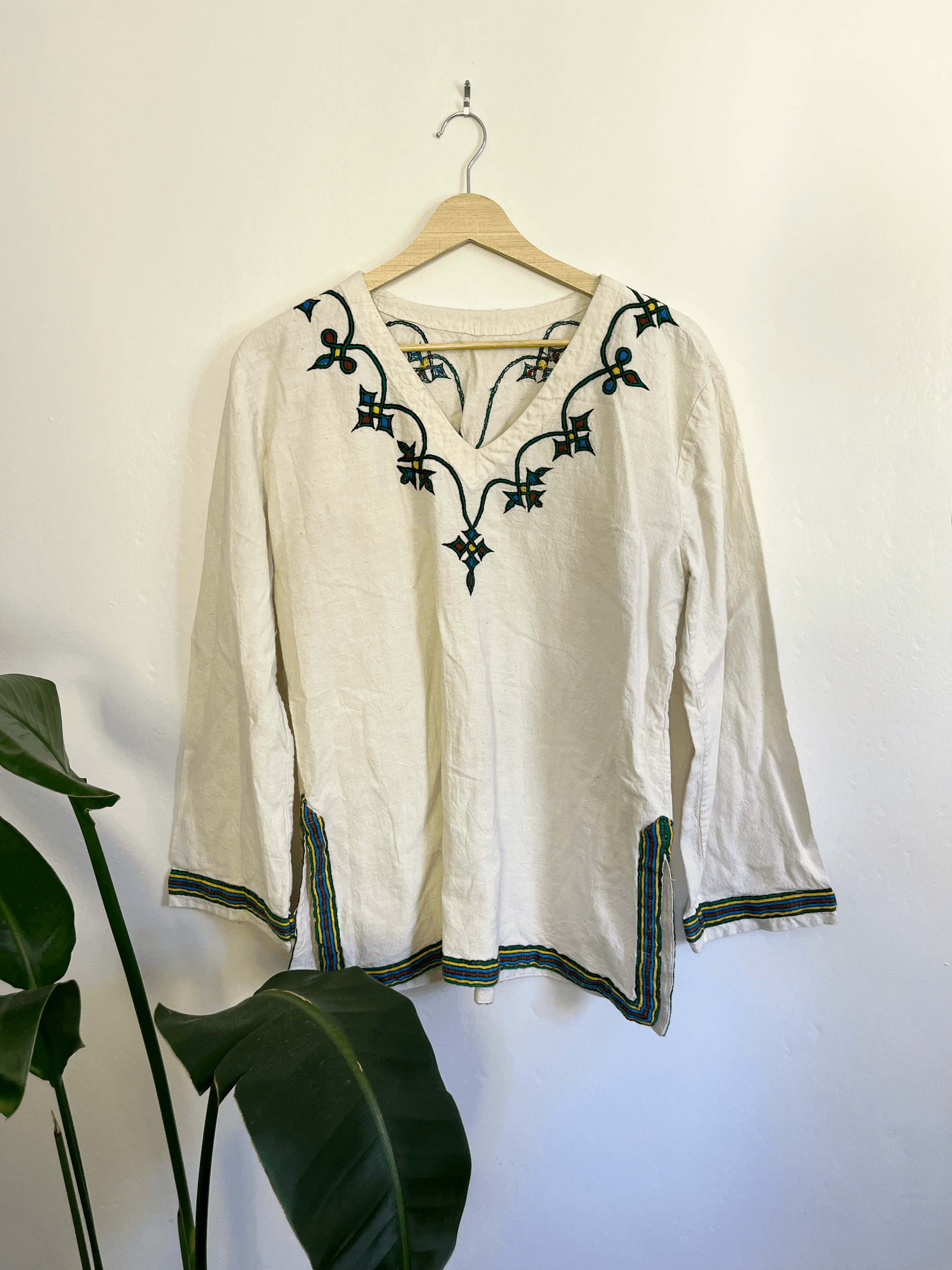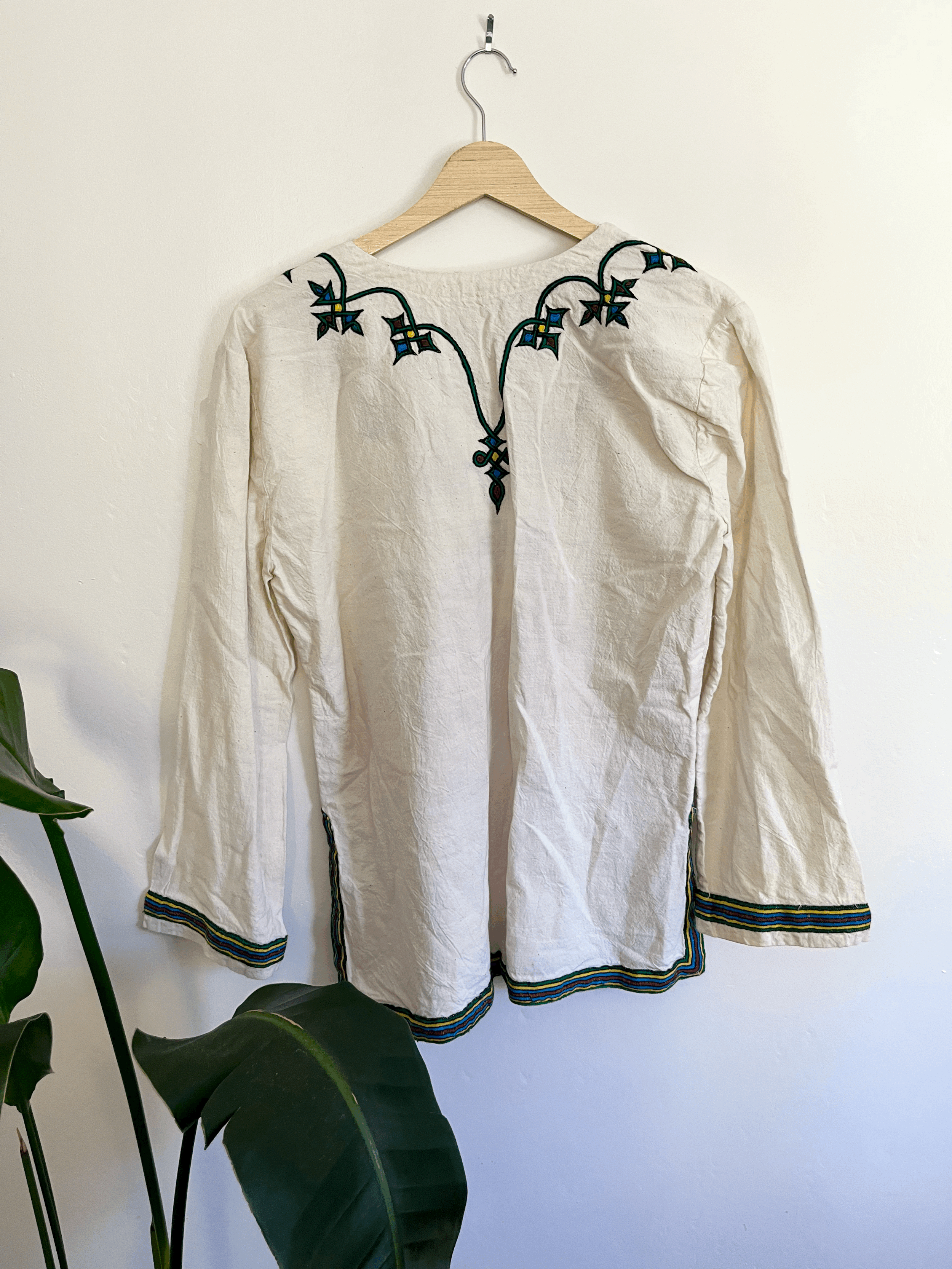 Vintage cream button-up blouse with brown embroidered detailing and a tunic-style silhouette. This piece is from the 1970s. Heavily stained throughout with visible pit staining and a missing bottom button. Long sleeve. This piece is 100% cotton. Country Suburban brand.