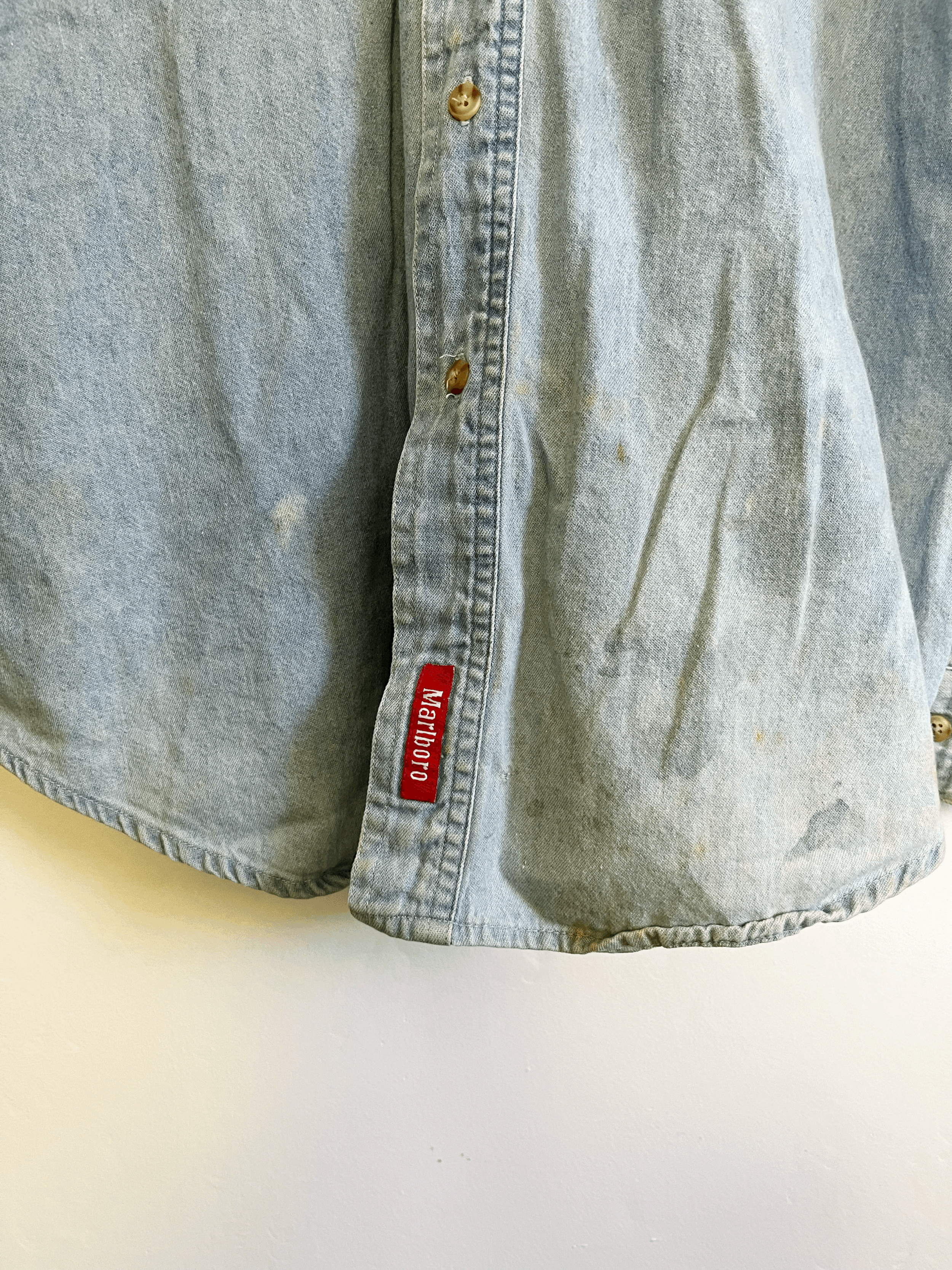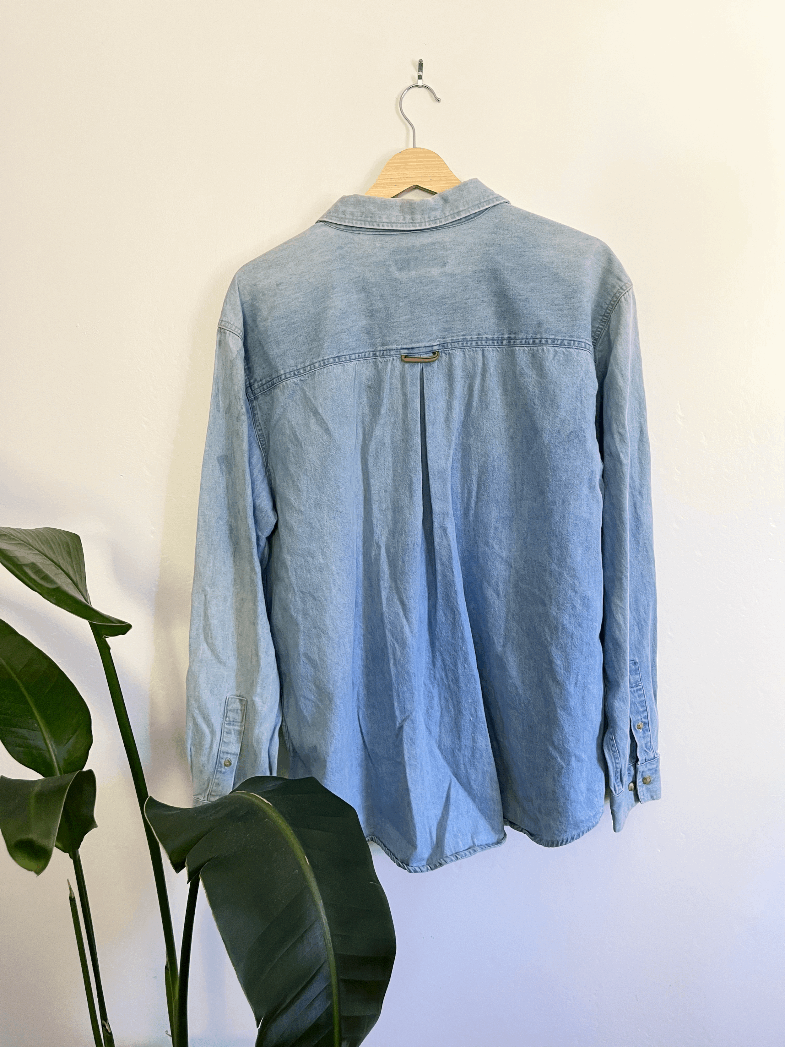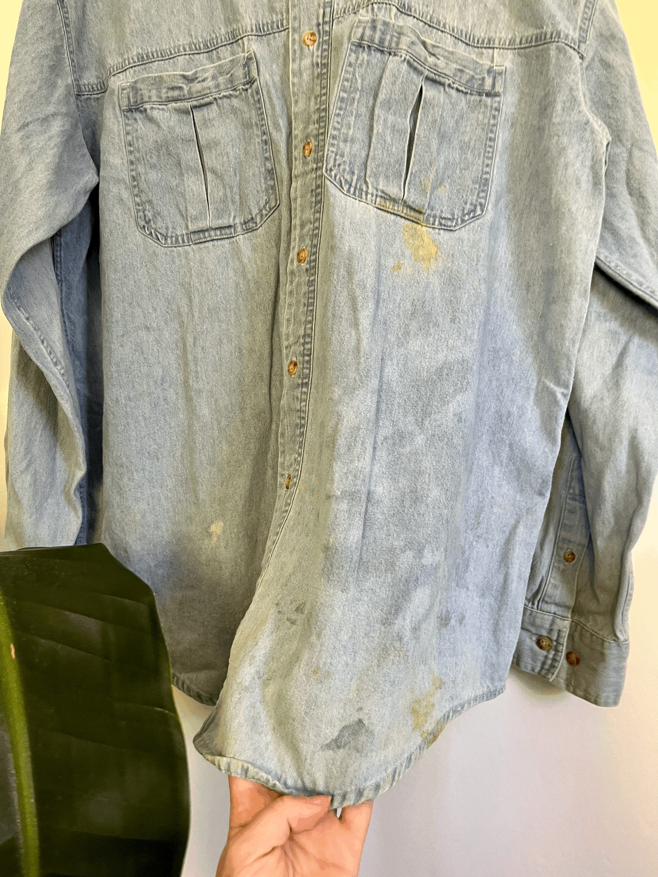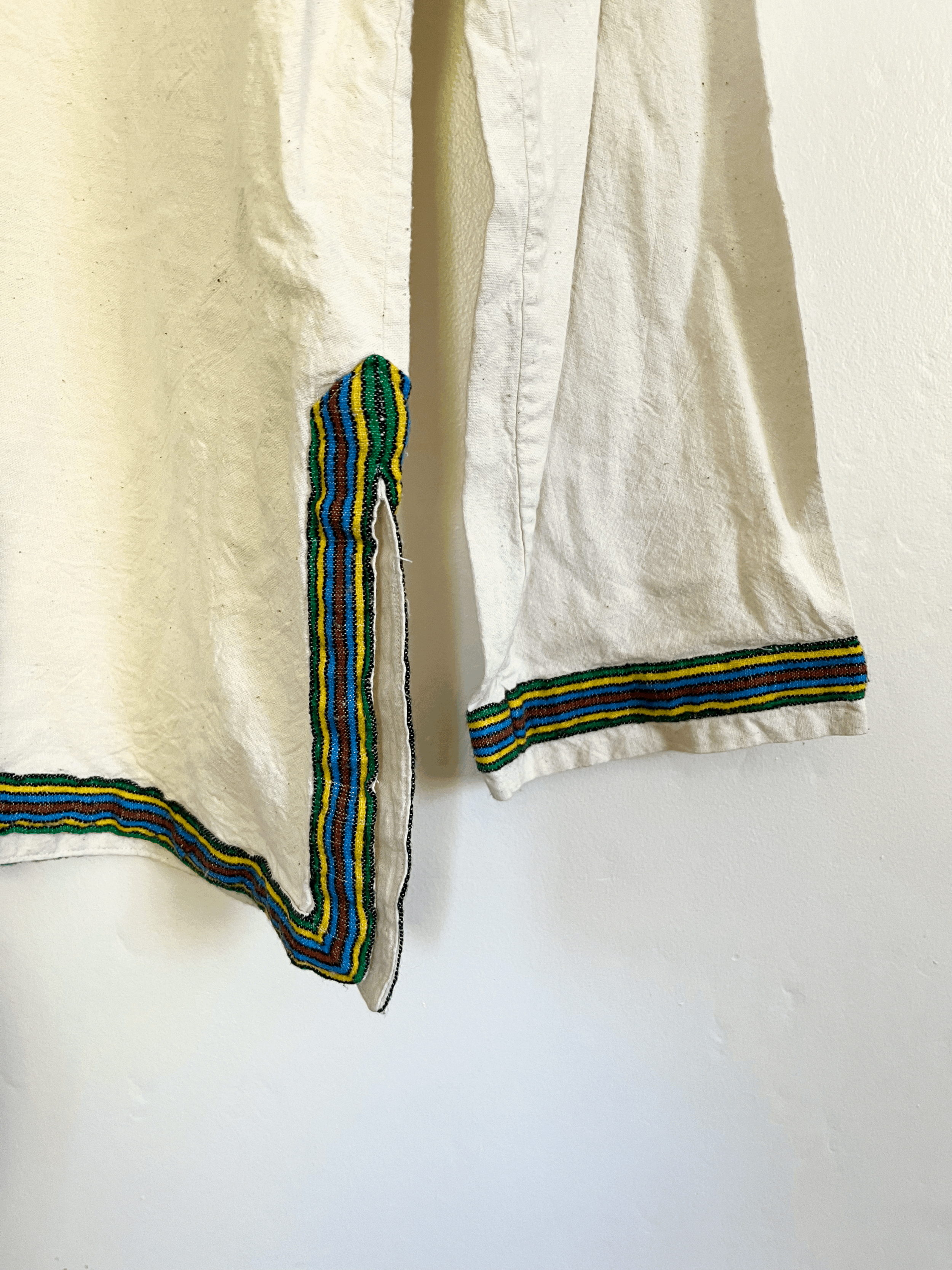 Vintage cream button-up blouse with brown embroidered detailing and a tunic-style silhouette. This piece is from the 1970s. Heavily stained throughout with visible pit staining and a missing bottom button. Long sleeve. This piece is 100% cotton. Country Suburban brand.