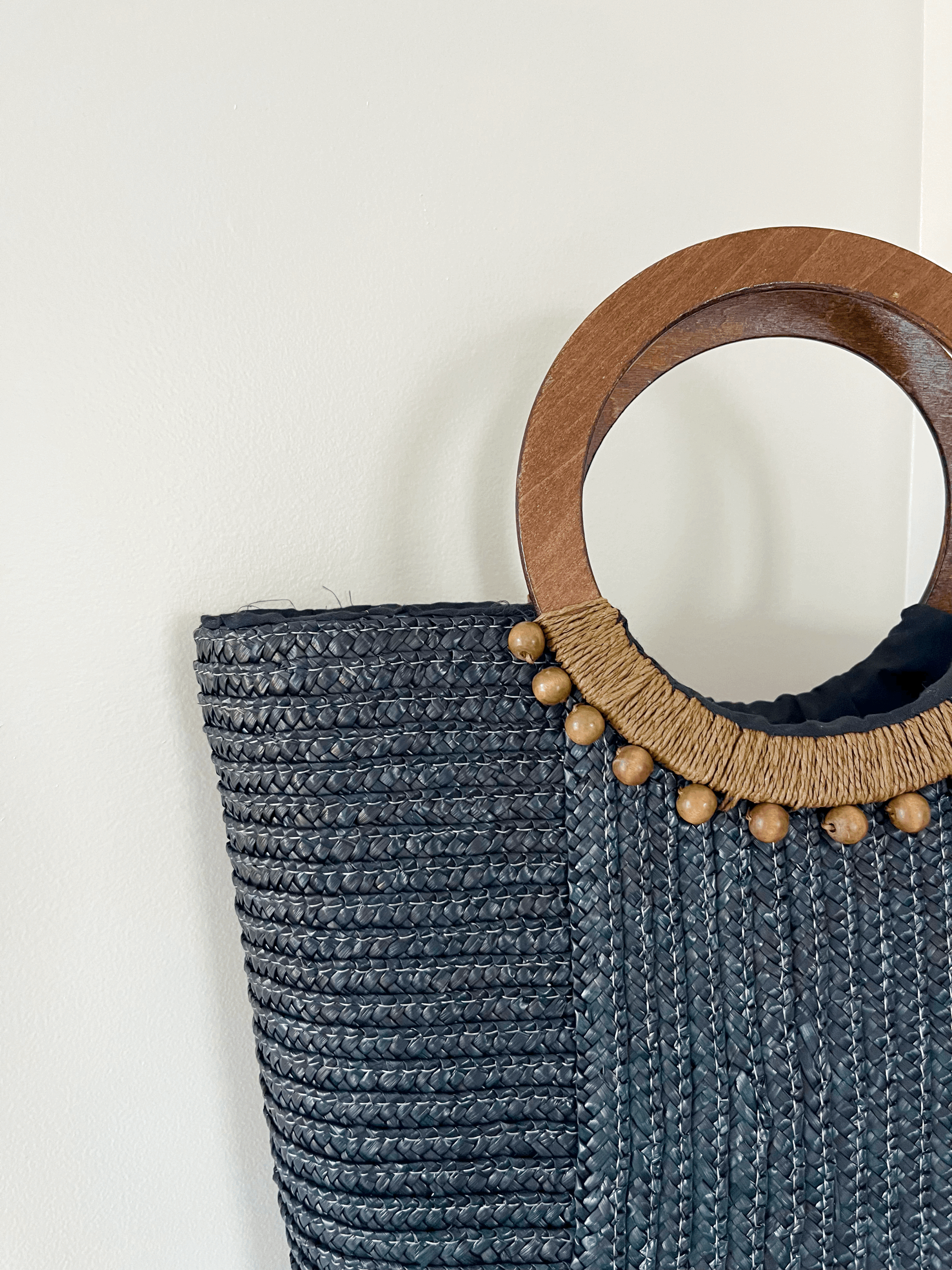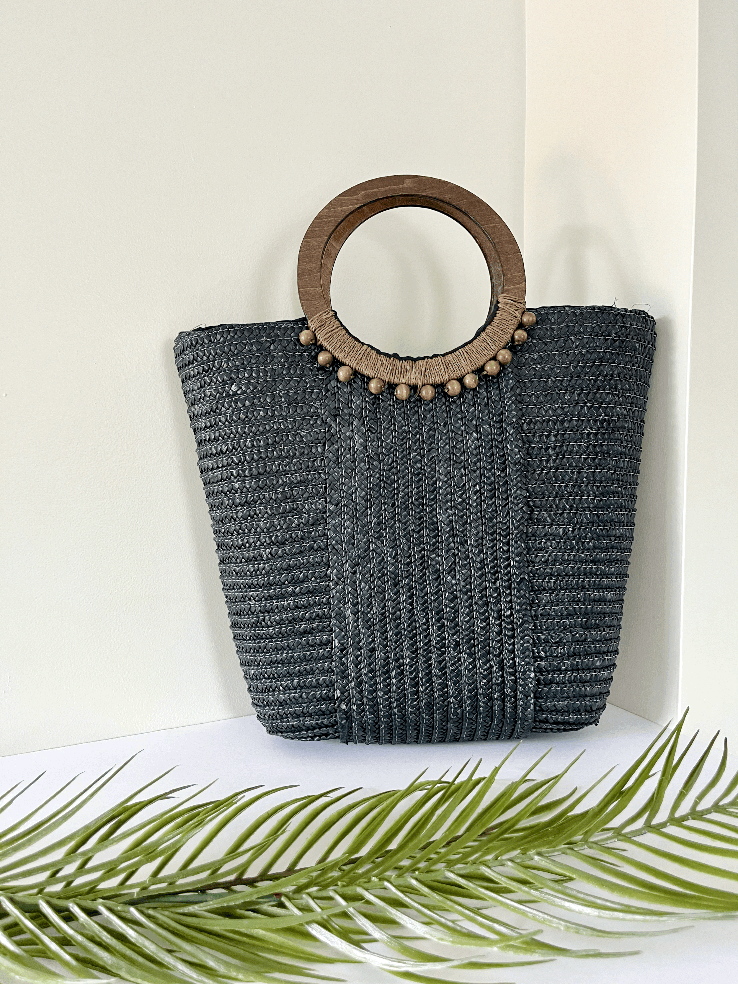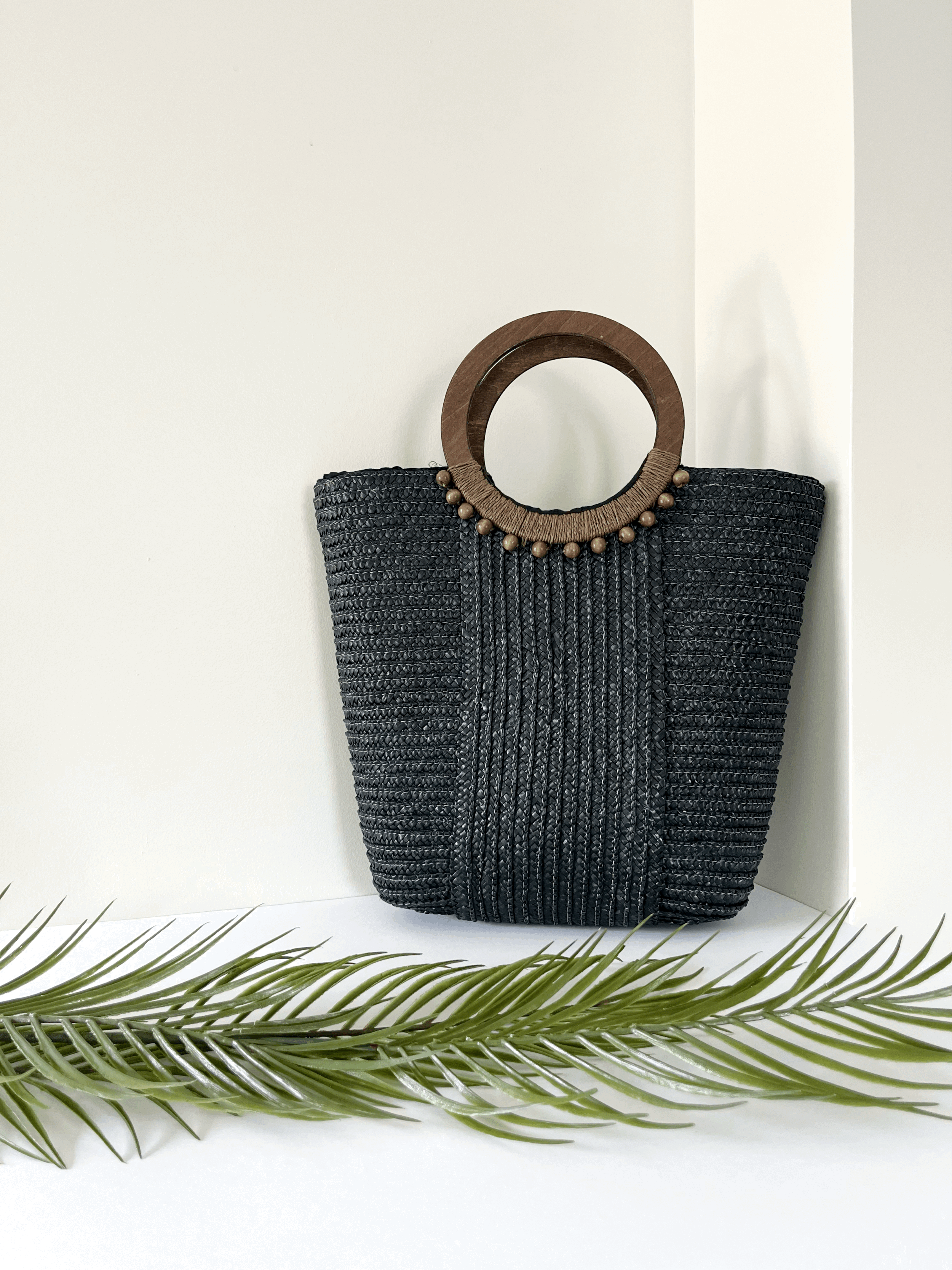 Black straw tote bag with wooden handles. Features large round wooden handles and decorative wooden accents, with a boho-inspired design. Lined interior includes two small pockets. This piece is in good condition.