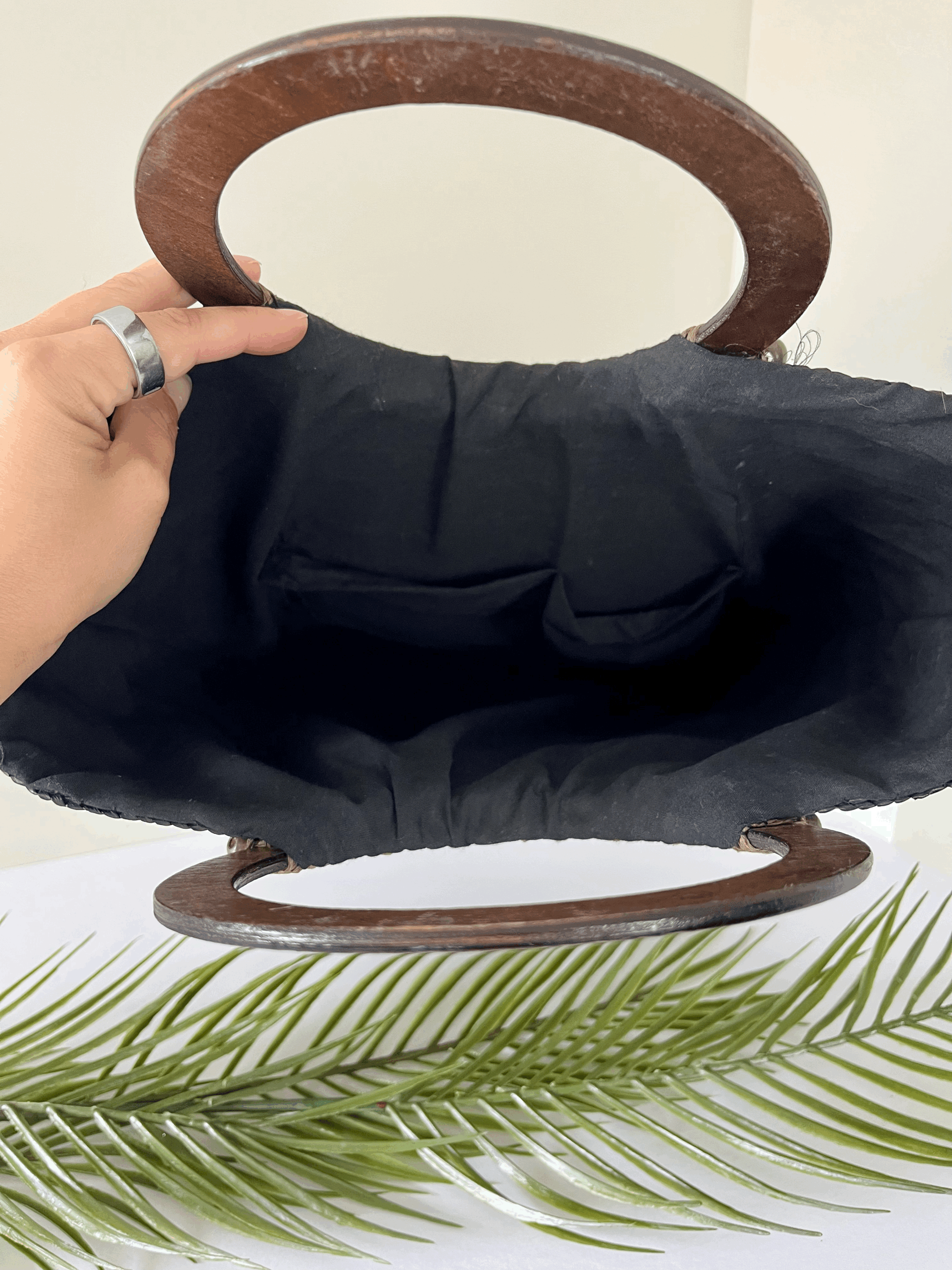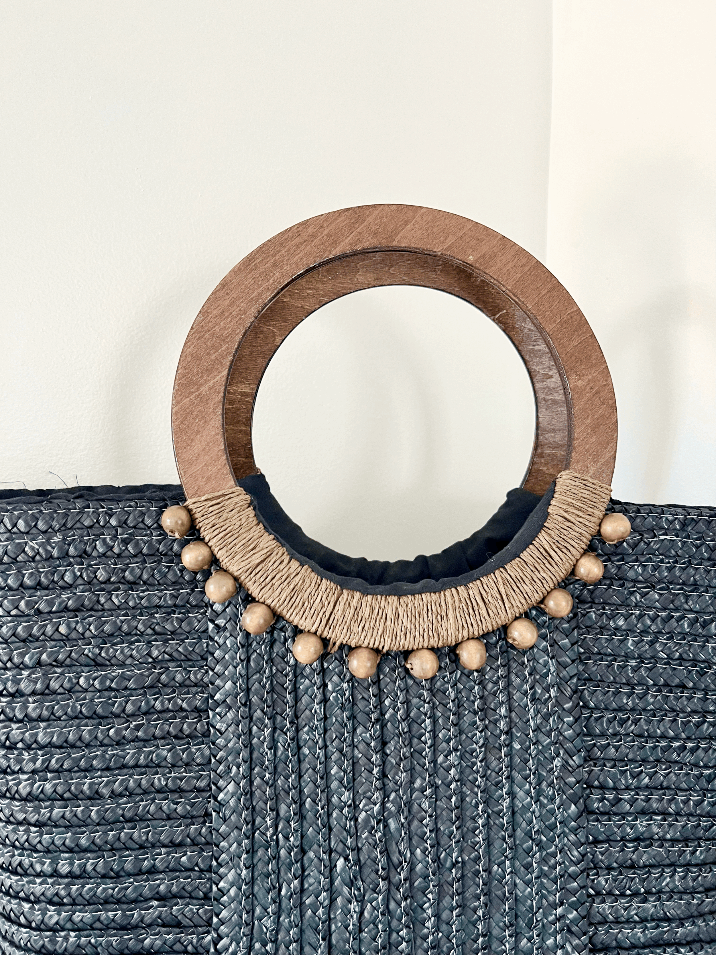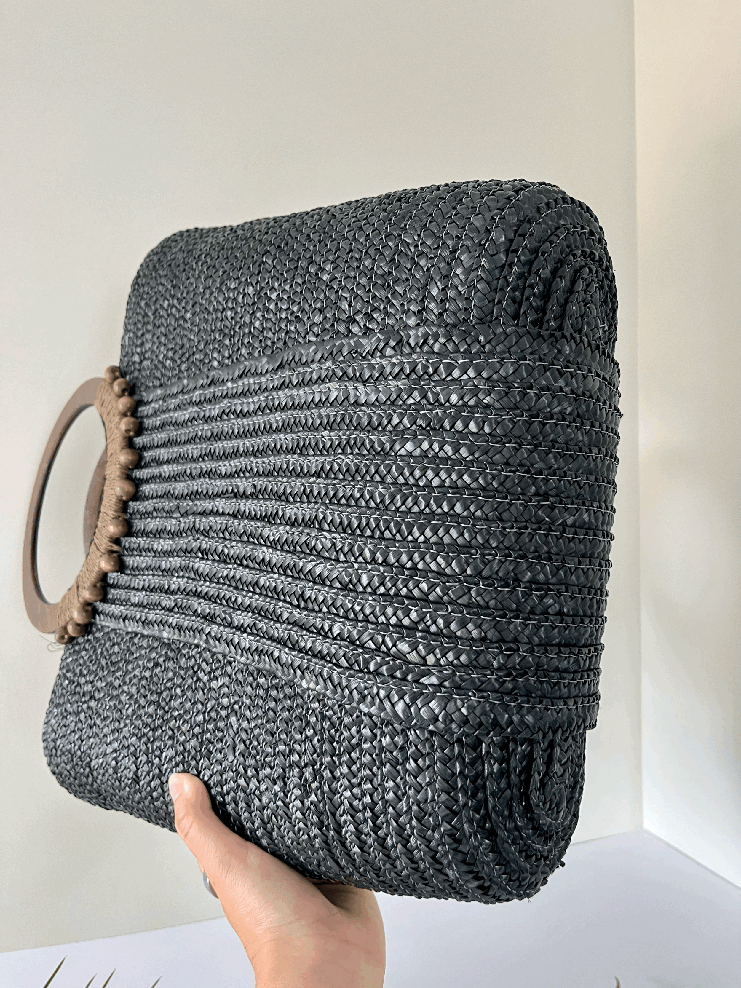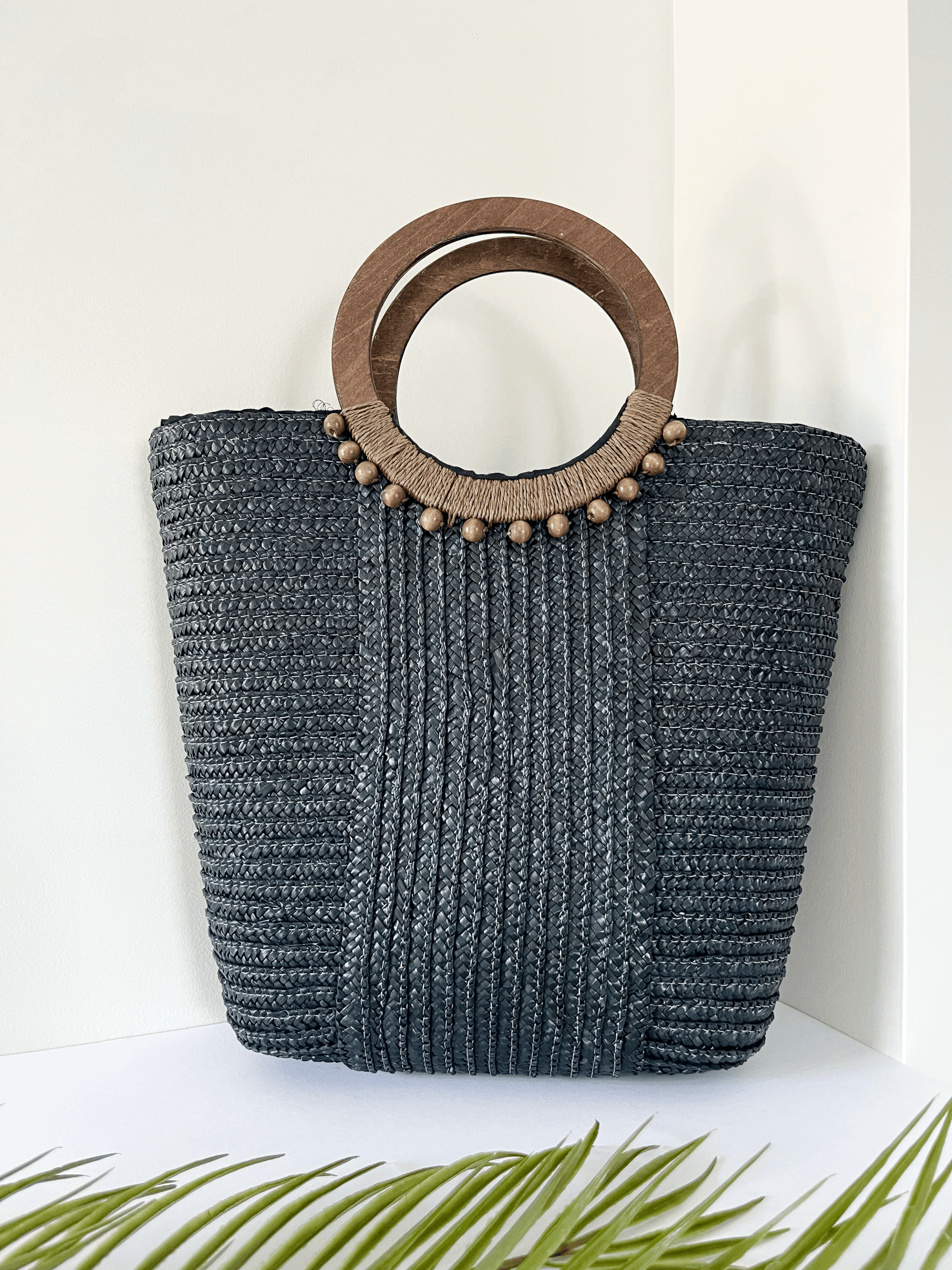 Black straw tote bag with wooden handles. Features large round wooden handles and decorative wooden accents, with a boho-inspired design. Lined interior includes two small pockets. This piece is in good condition.