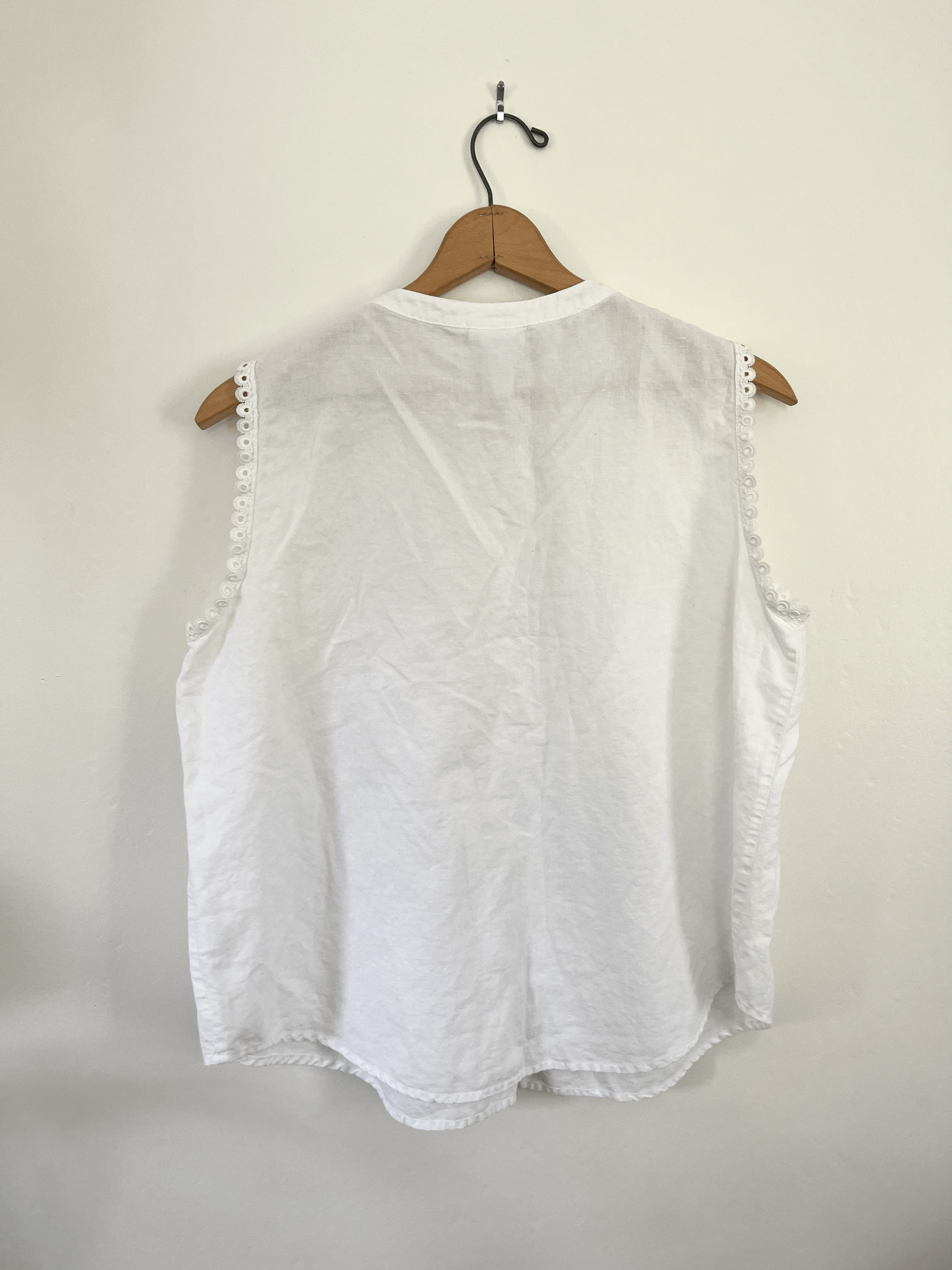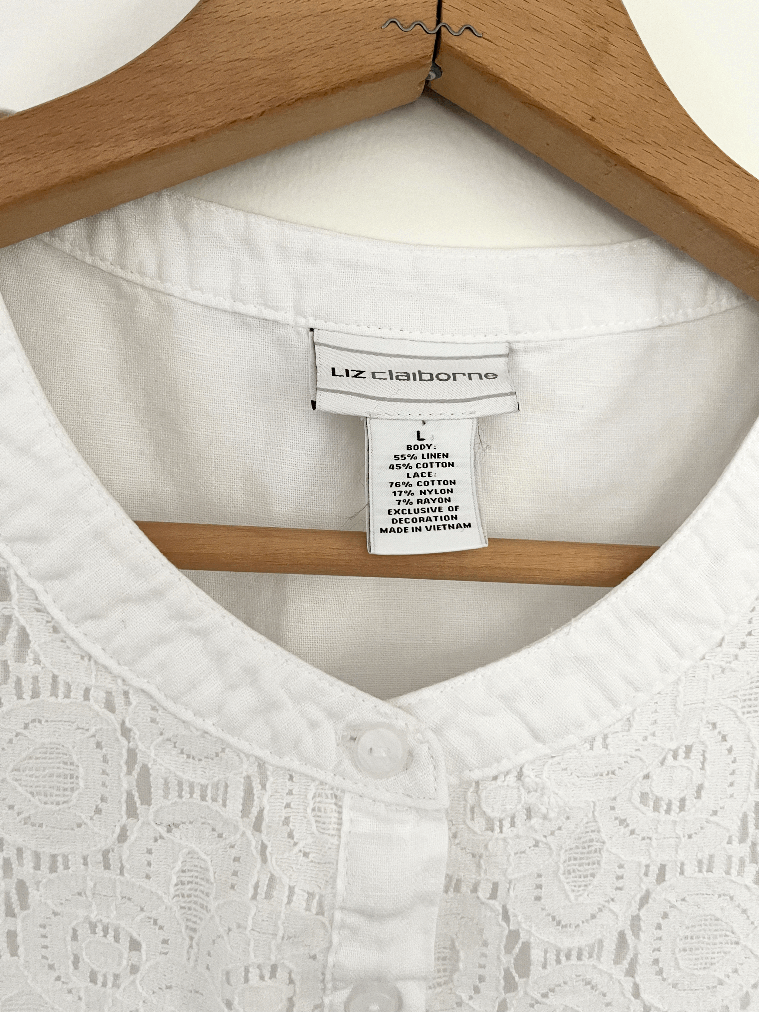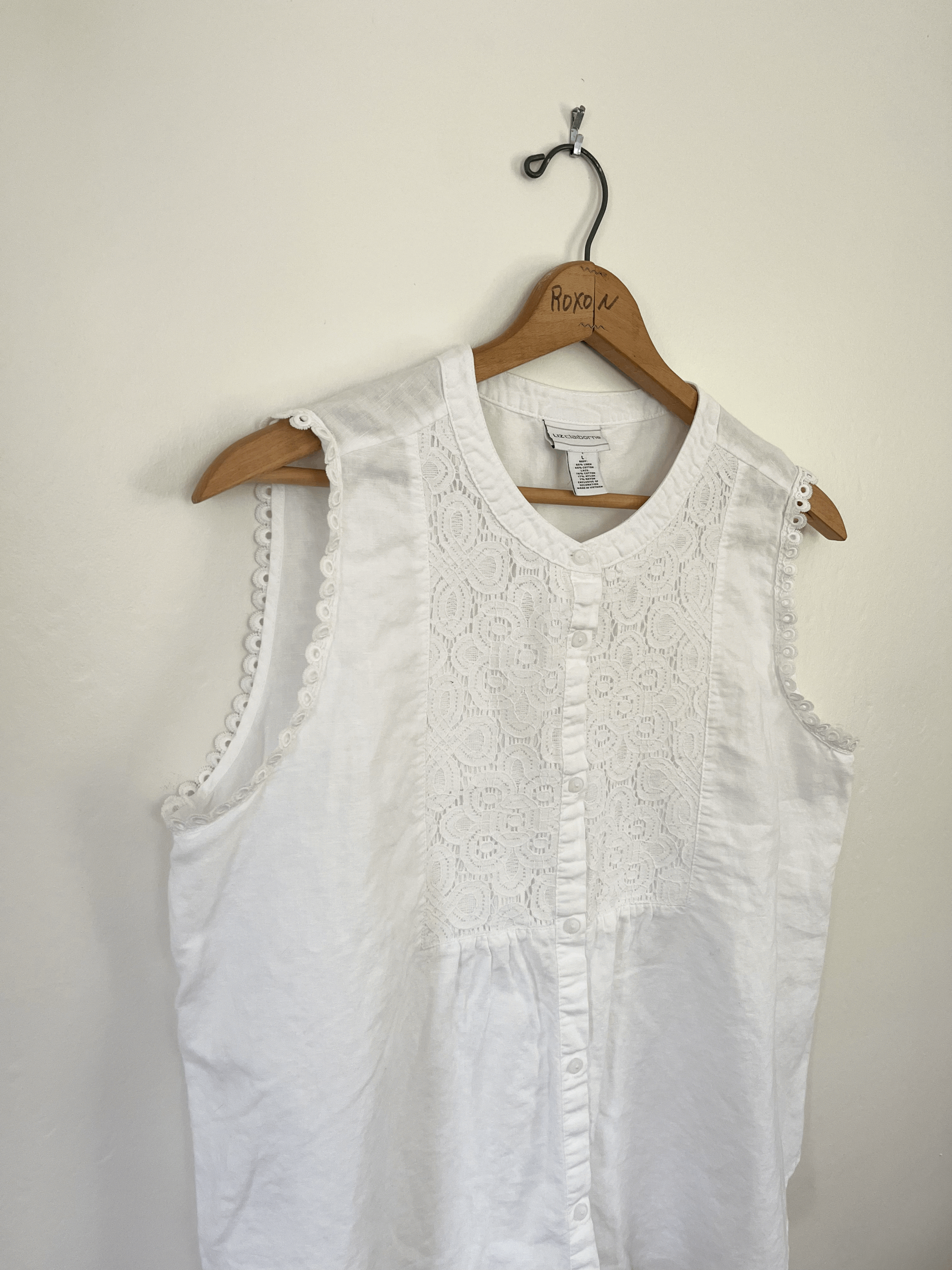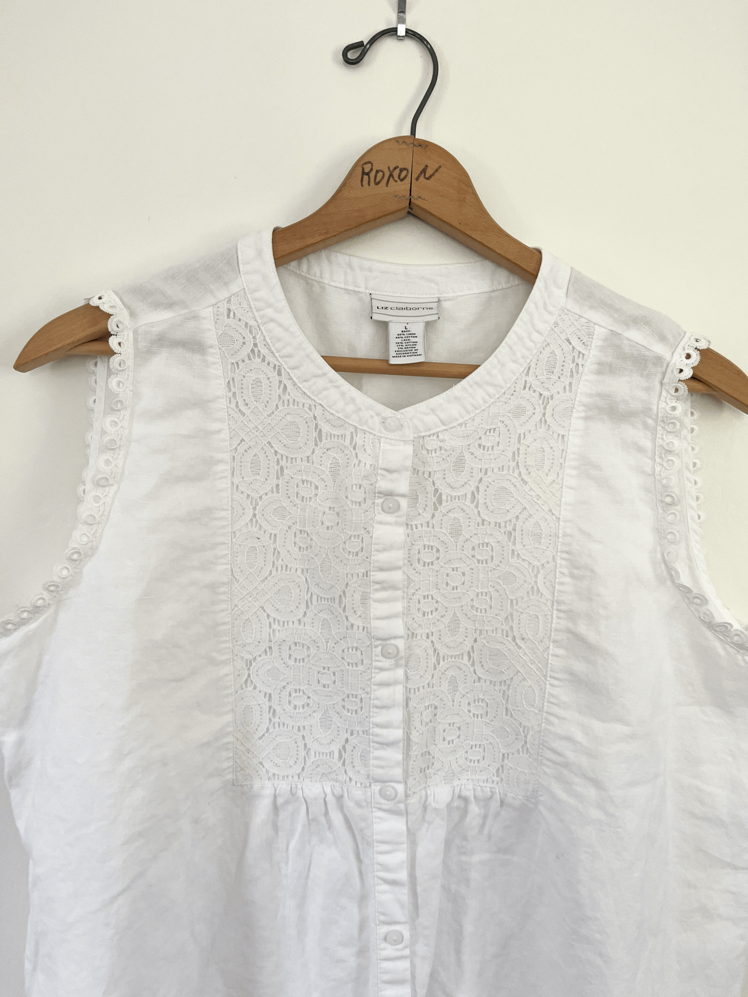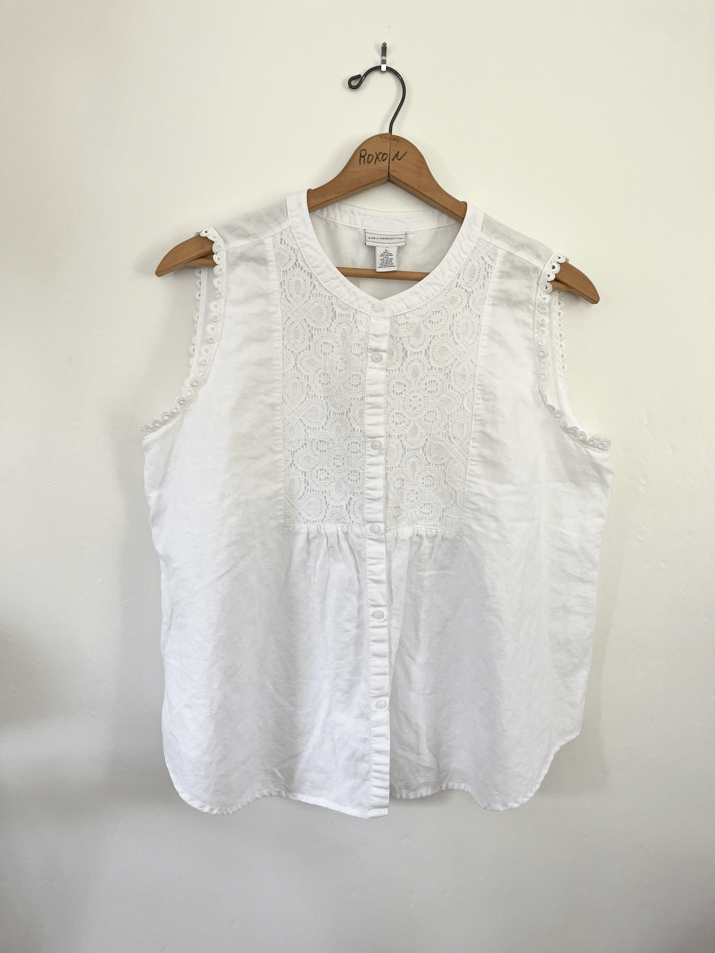 Vintage white eyelet lace tank top blouse by Liz Claiborne. Made from 55% linen and 45% cotton. Features a high neckline, flowy long fit, embroidered lace front panel, and eyelet detailing around the armholes. Buttons up fully in the front. This piece is in good vintage condition.