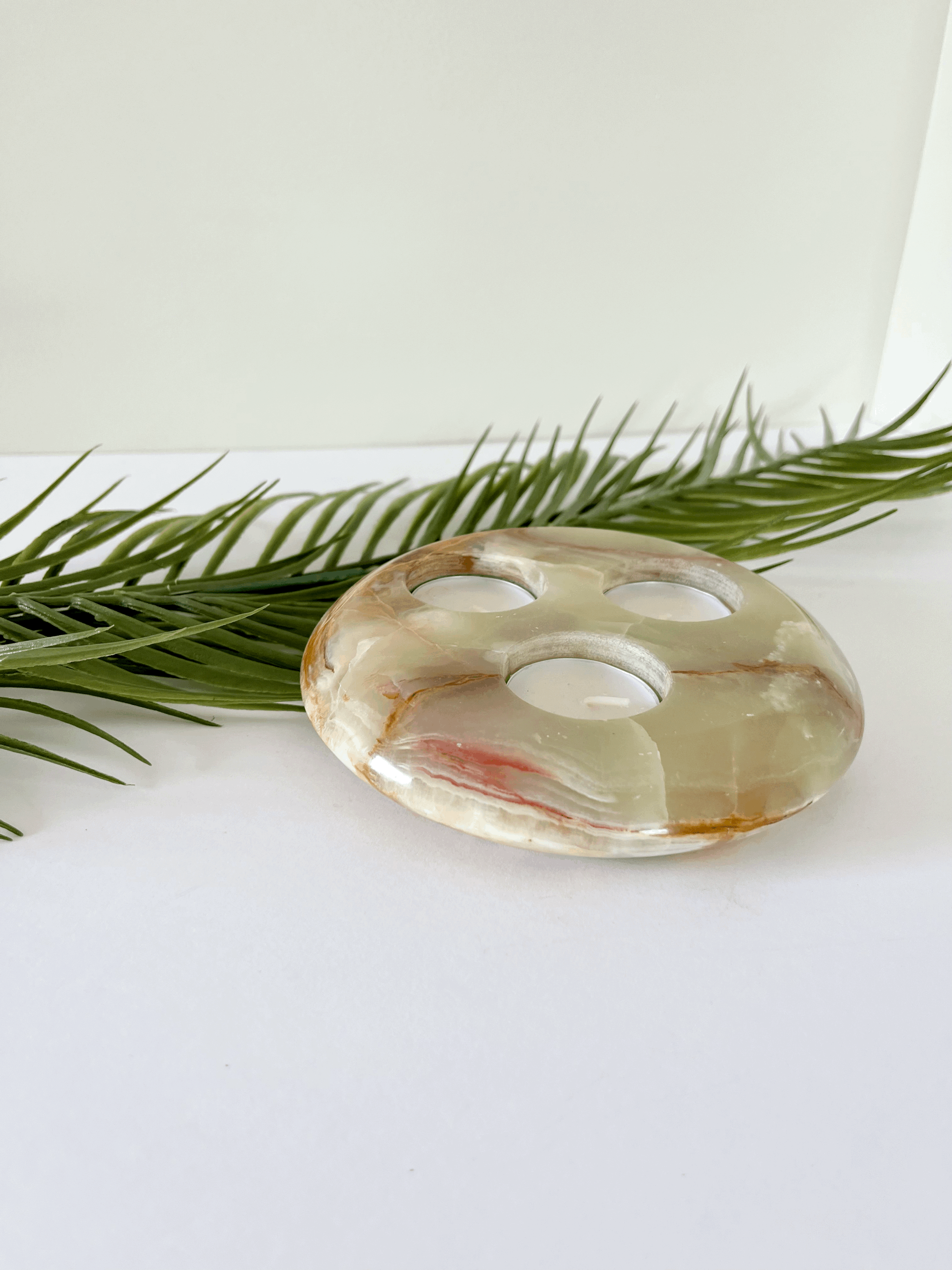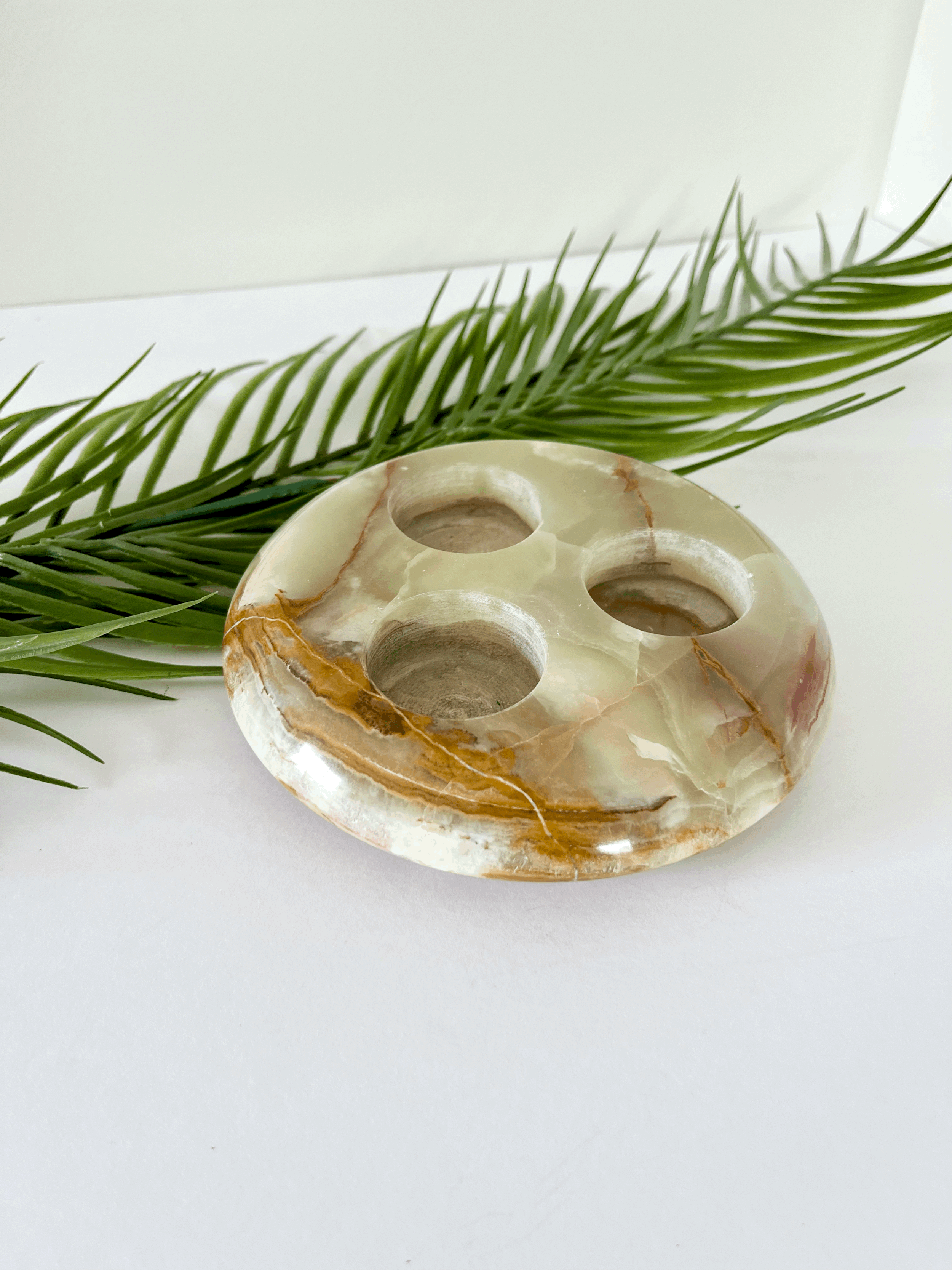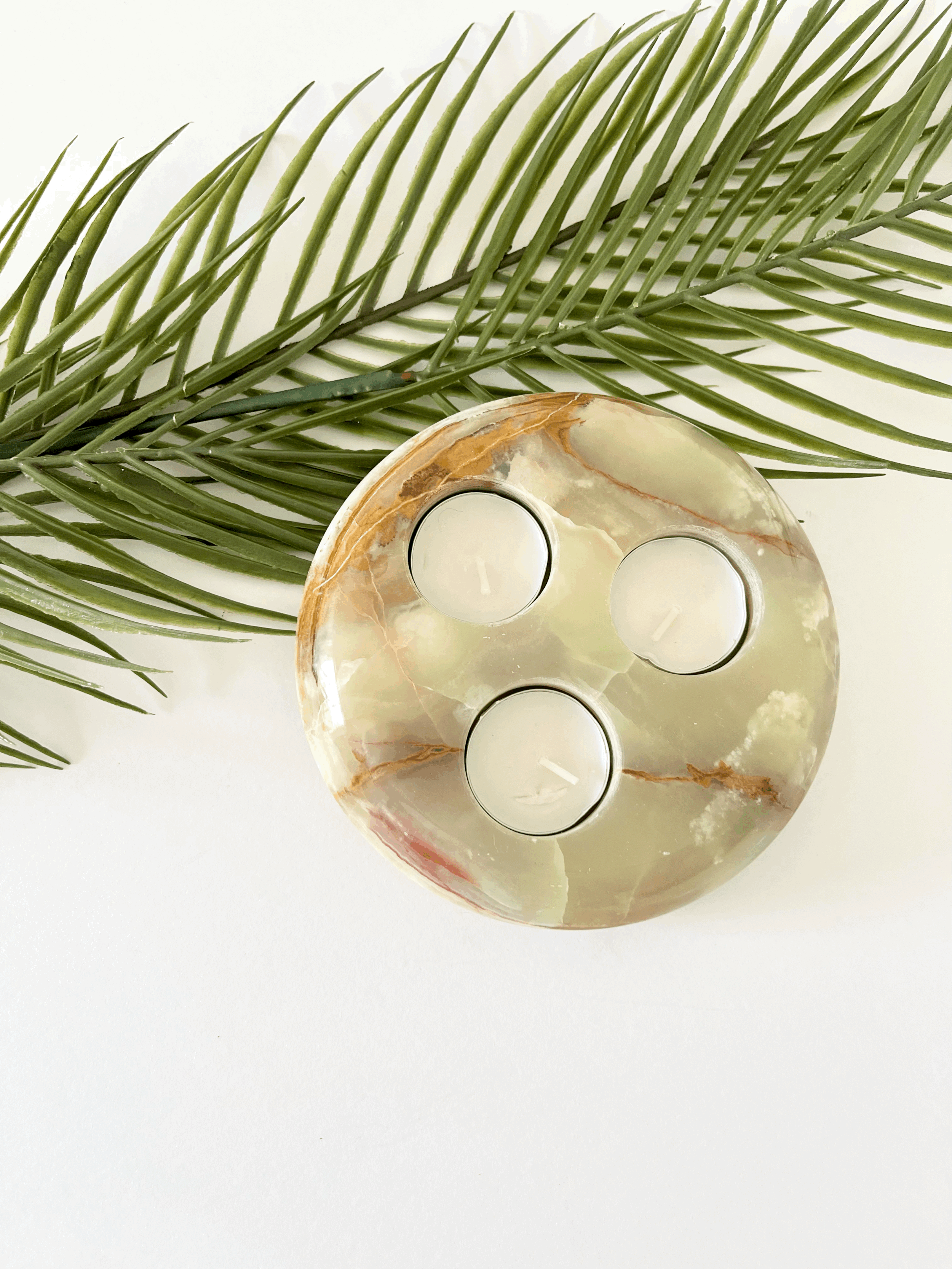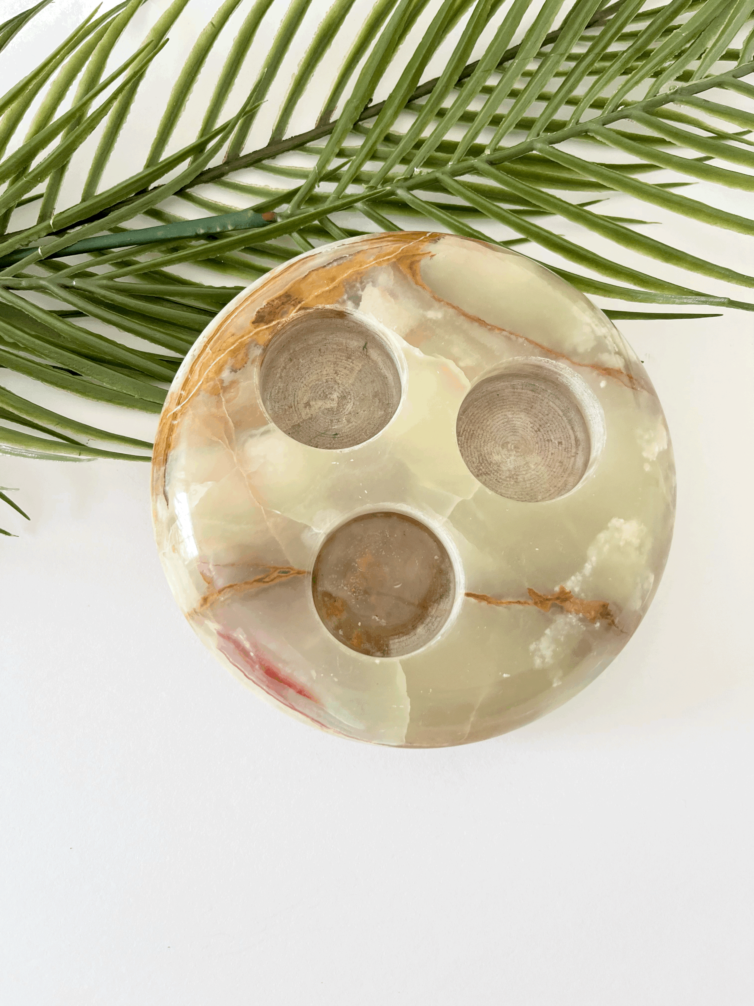 Vintage round onyx tea light candle holder. Made from solid green and brown marbled onyx, this heavy piece holds up to three candles. This item is in good vintage condition.