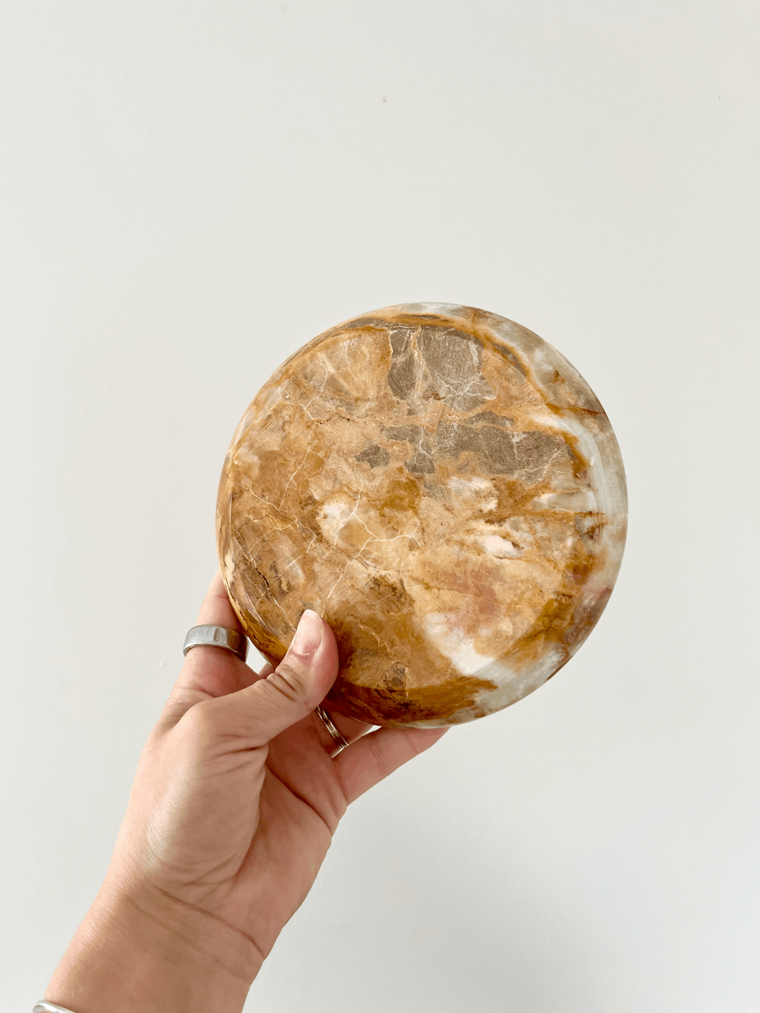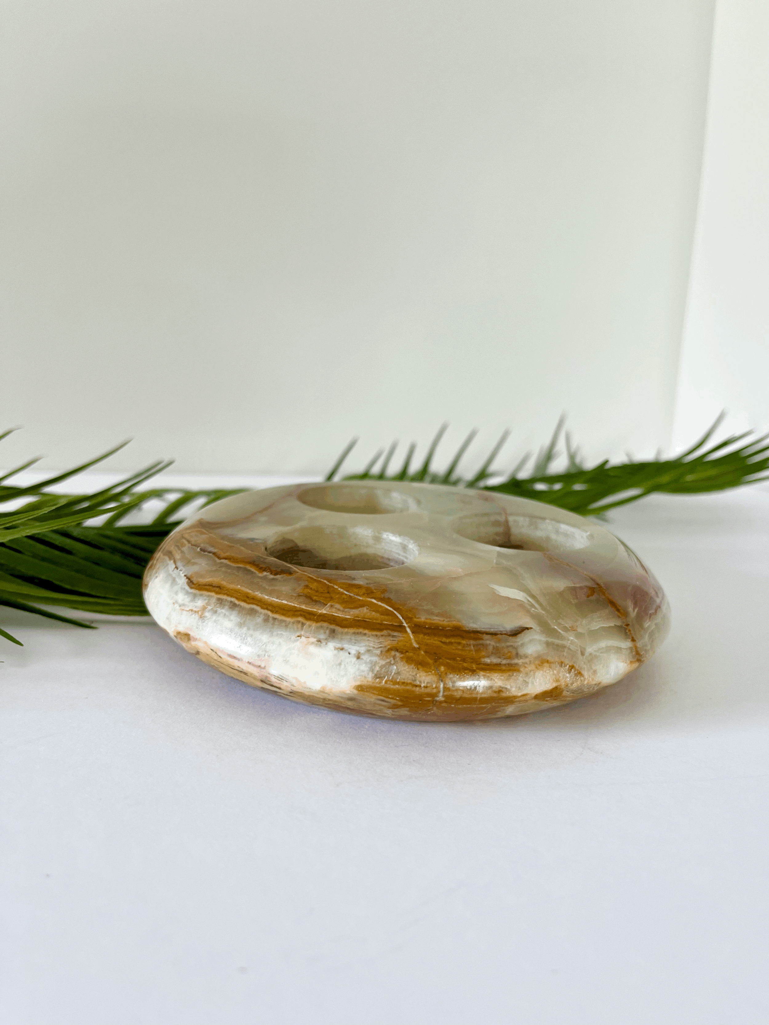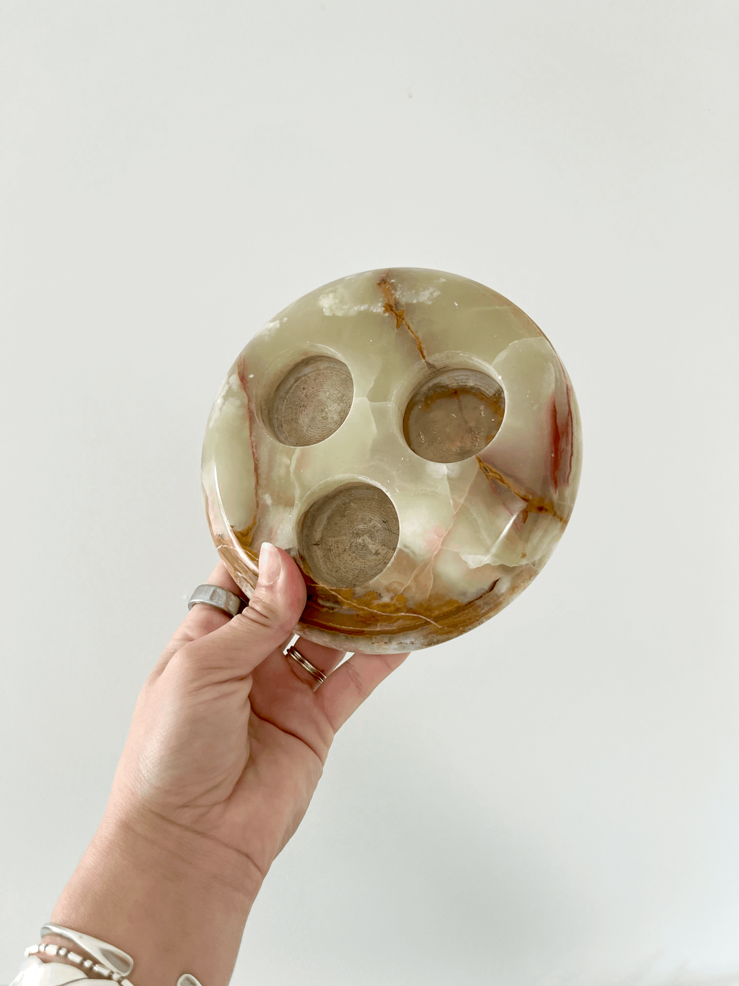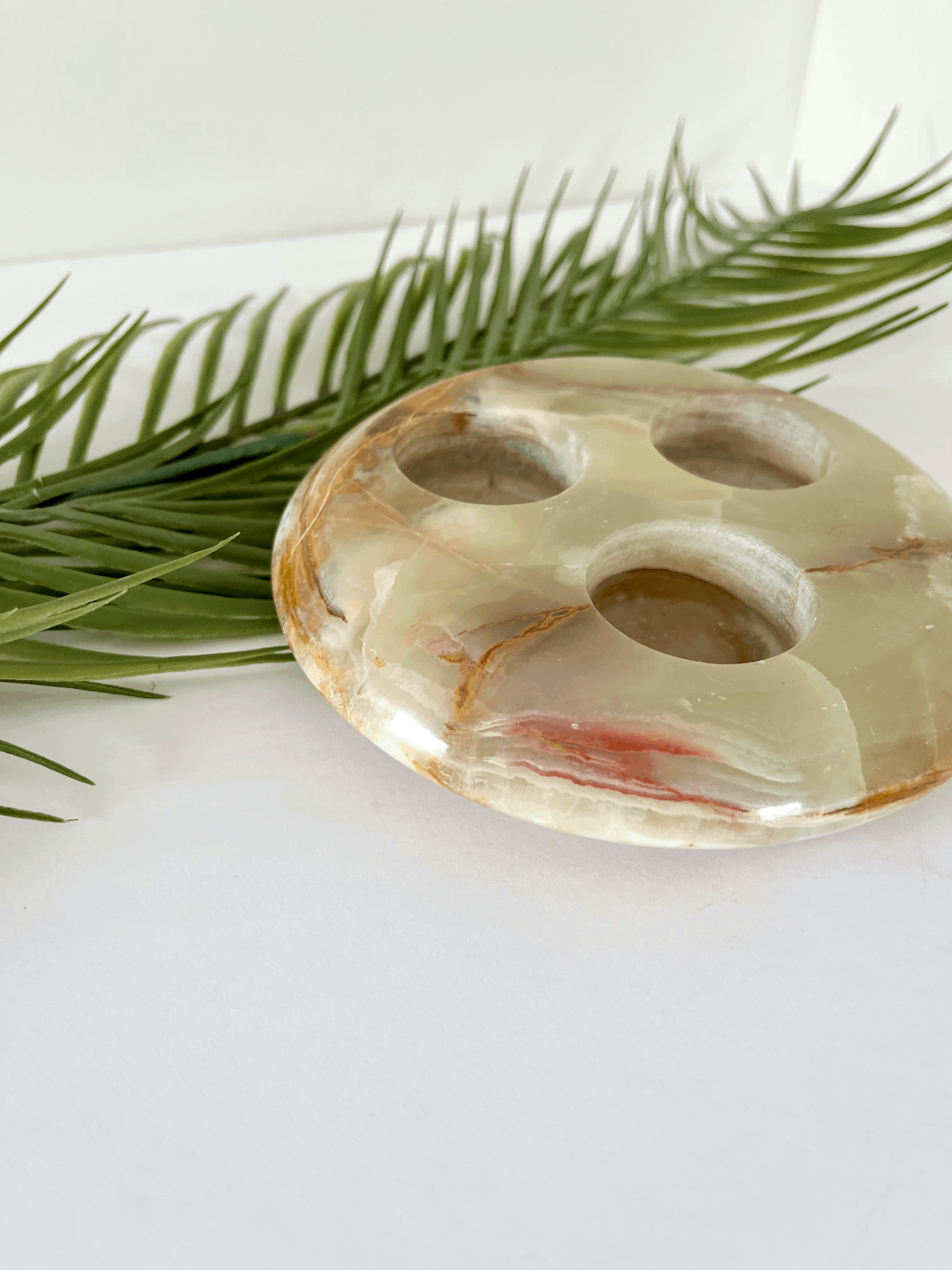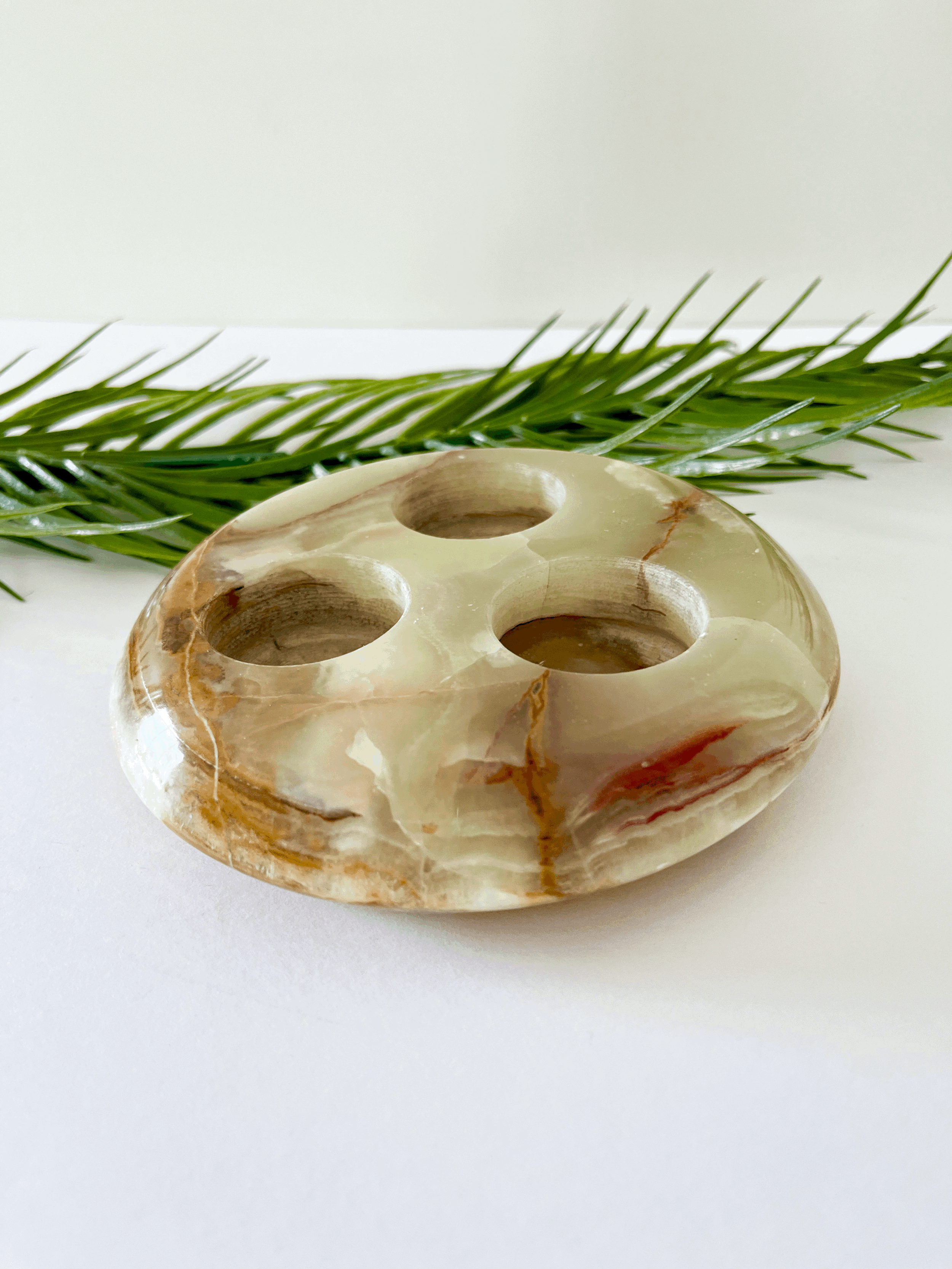 Vintage round onyx tea light candle holder. Made from solid green and brown marbled onyx, this heavy piece holds up to three candles. This item is in good vintage condition.
