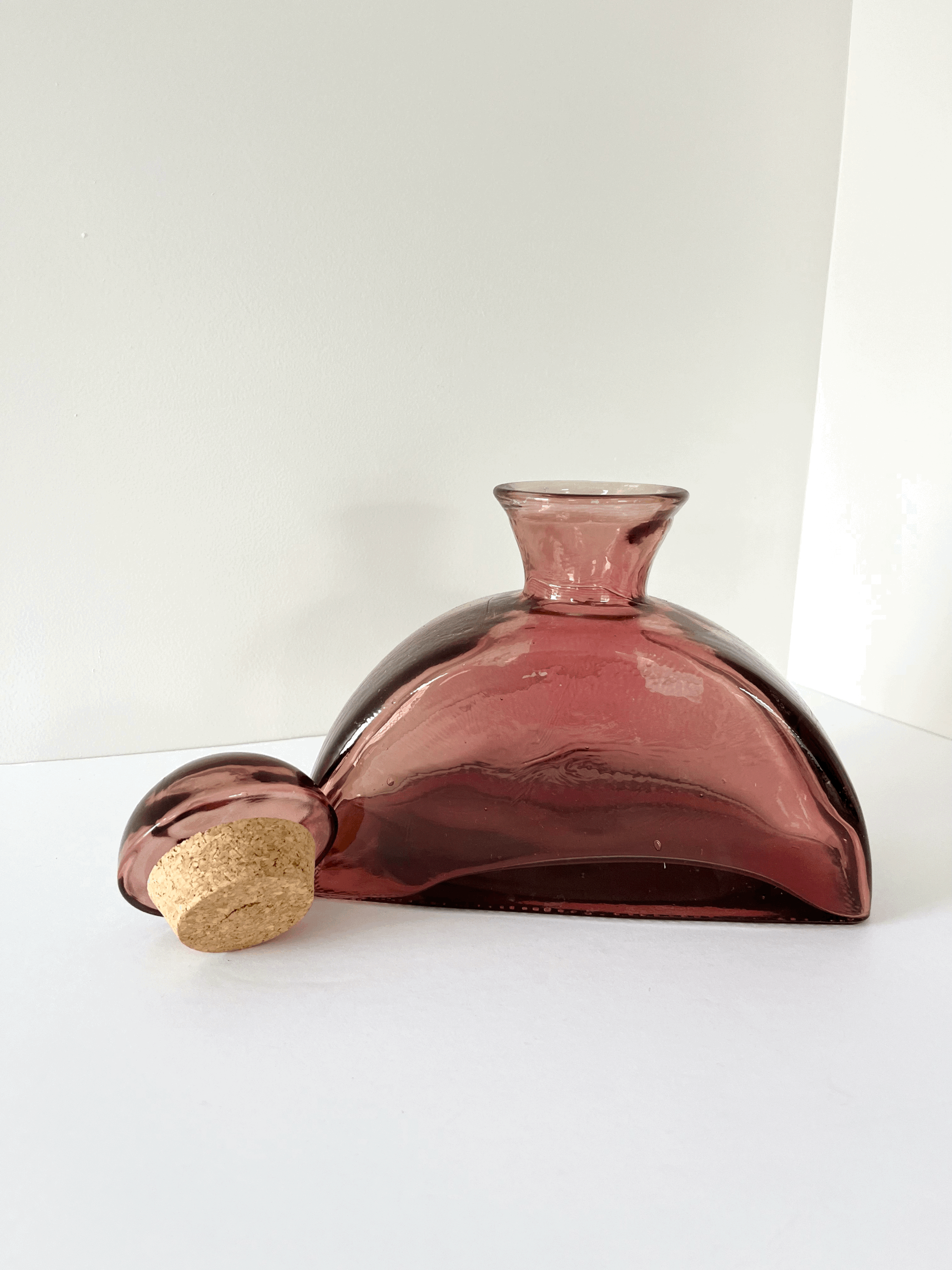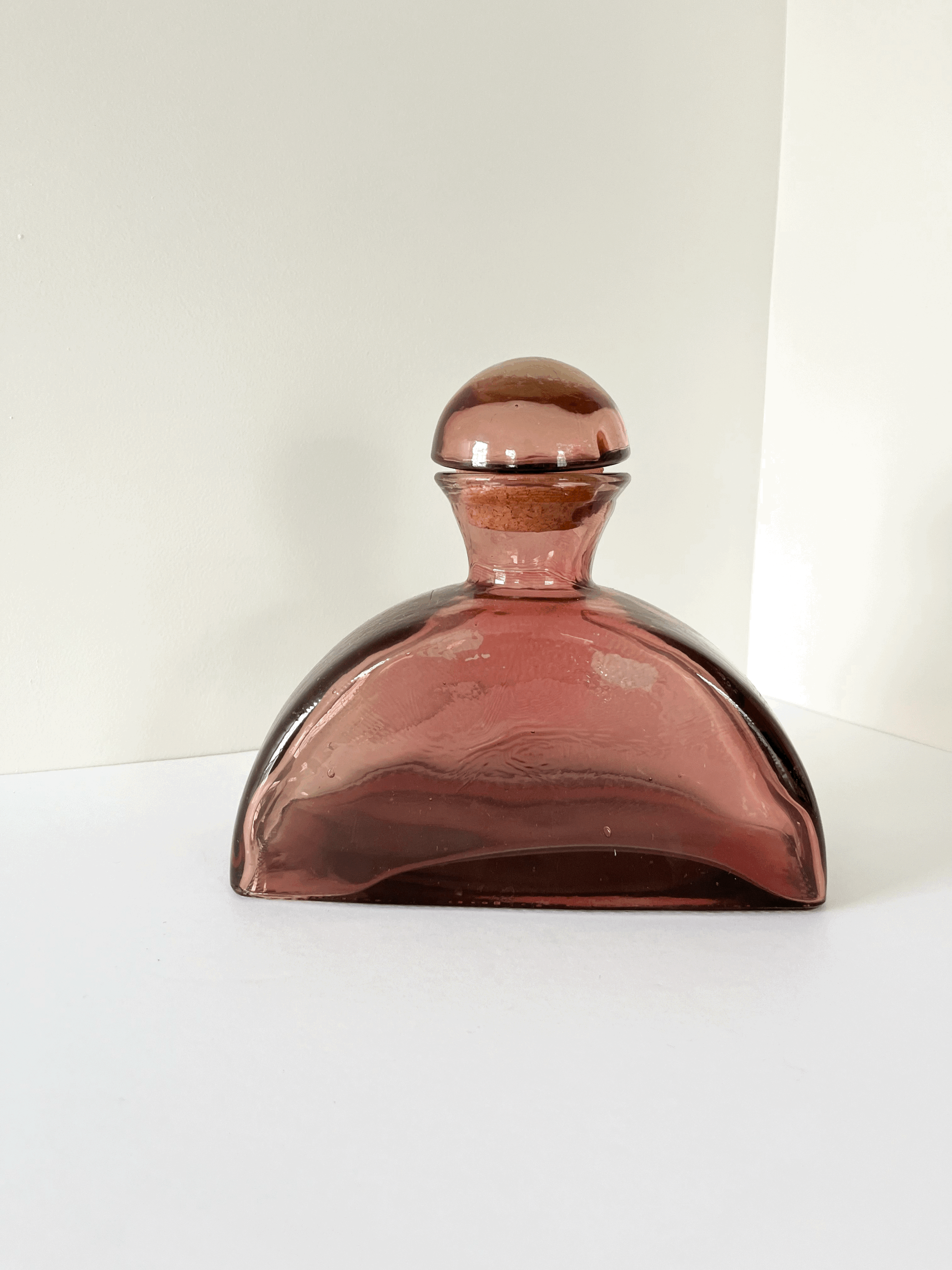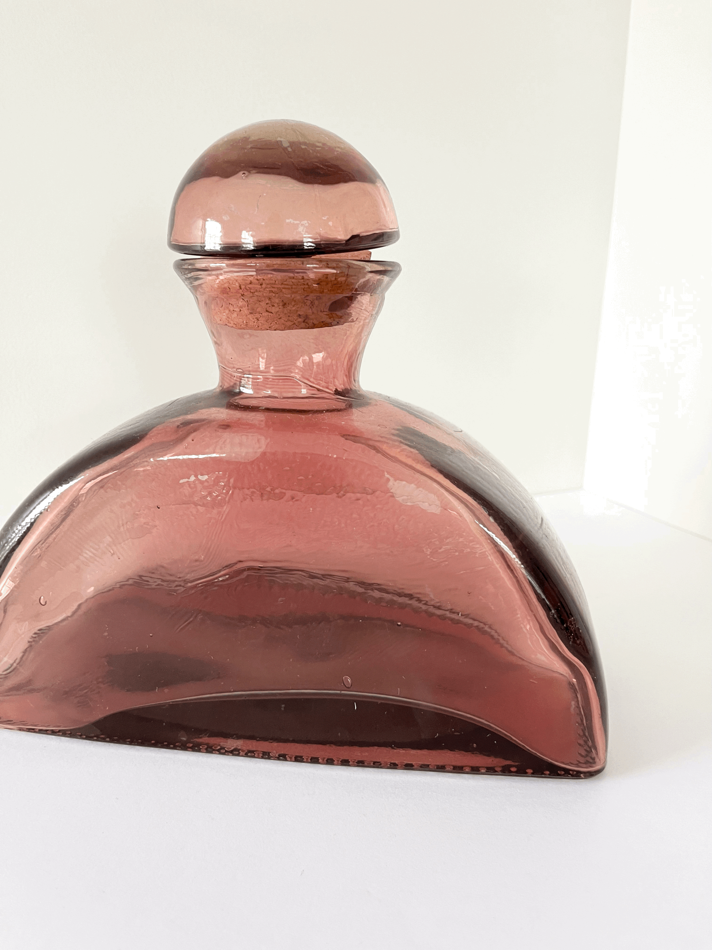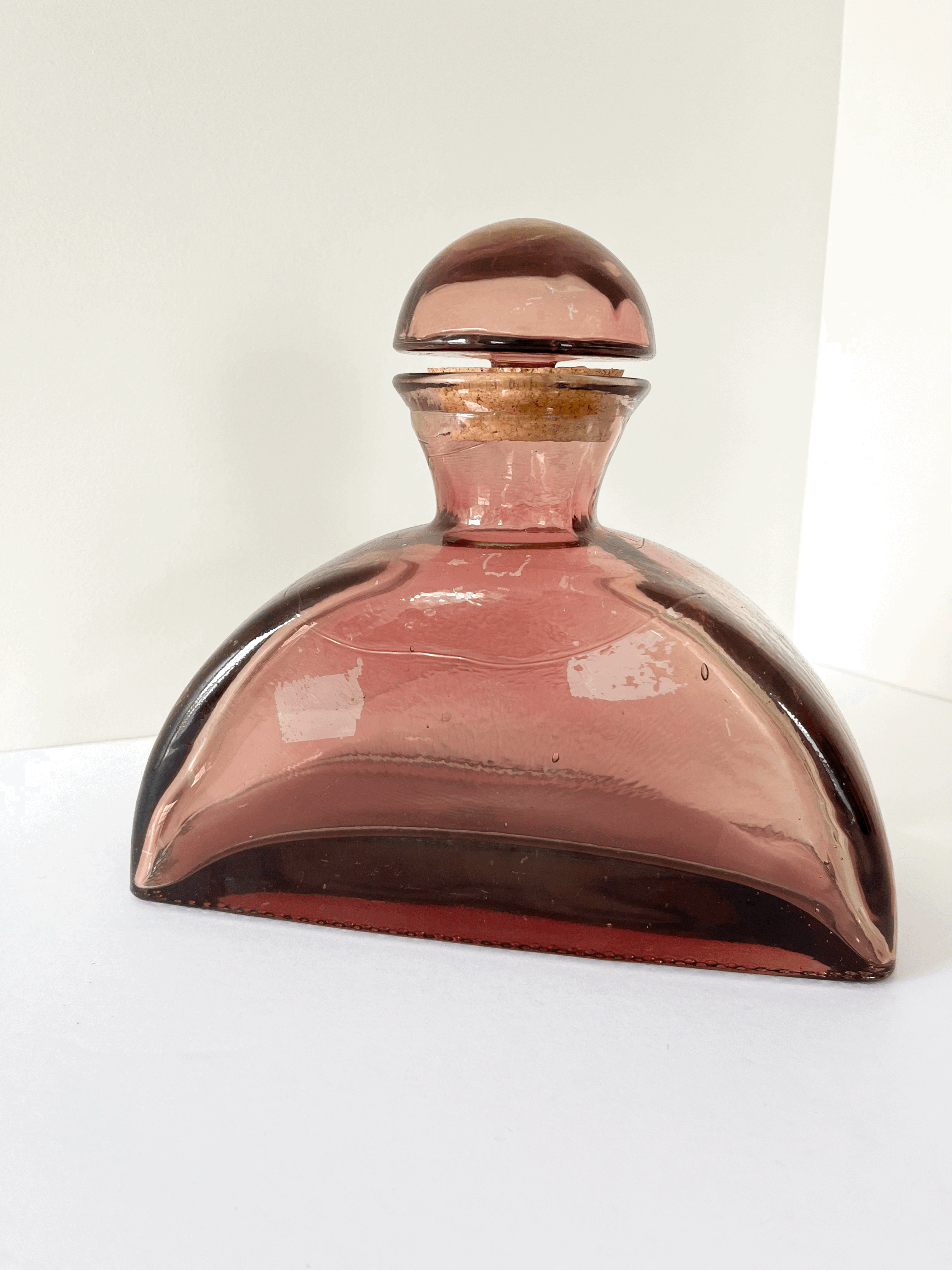 Antique clear rectangular decanter. Features a classic design with a cork that is coming apart. Federal law forbids the sale or reuse of this bottle—this marking was required on liquor bottles from 1935 to 1964 to prevent illegal refilling after Prohibition. This piece is in vintage condition and intended for decorative use only.
