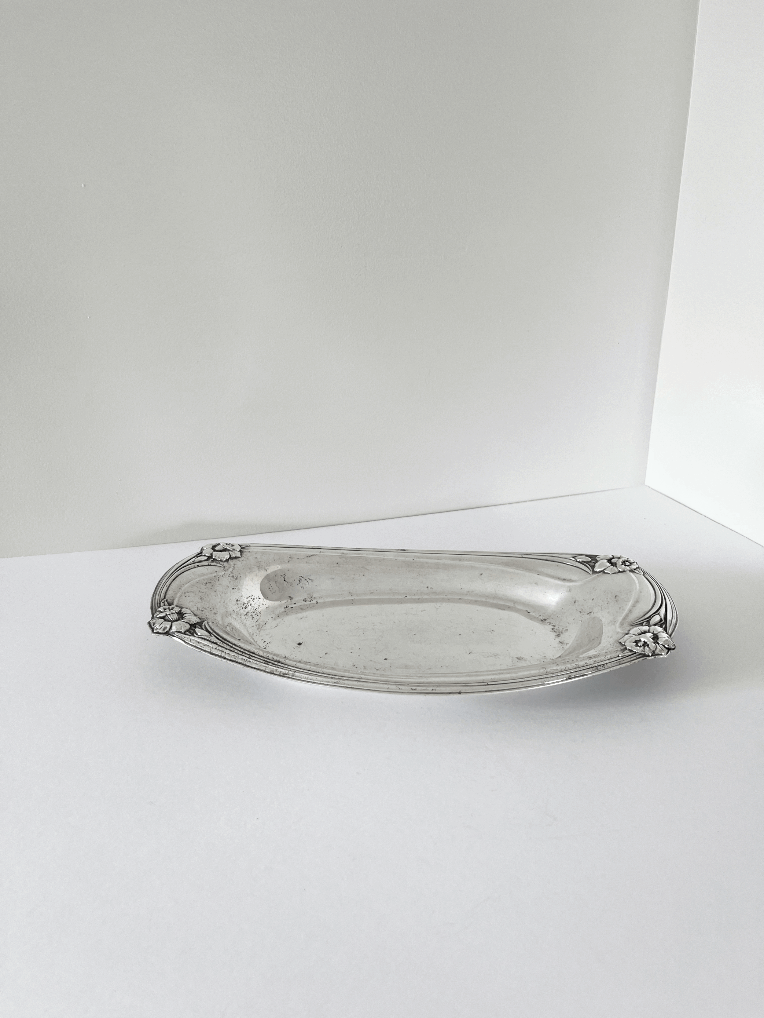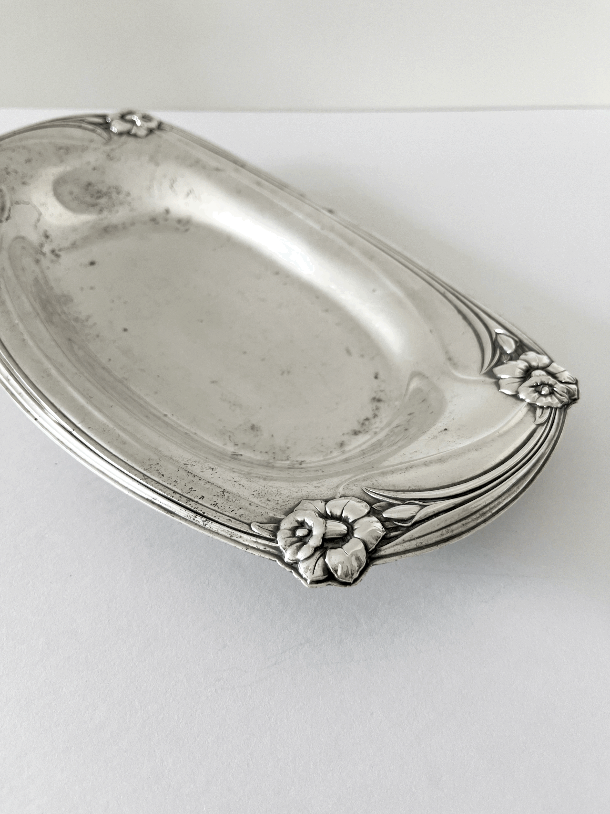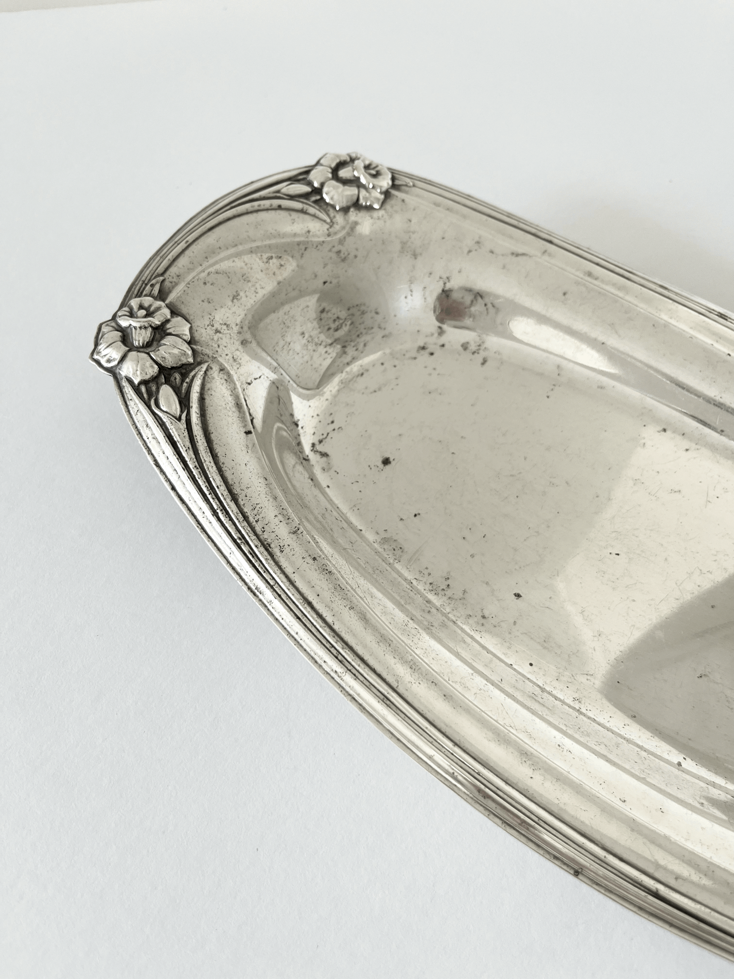Vintage 1950s silver-plated serving dish by 1847 Rogers Bros, featuring the Daffodil pattern. Art Nouveau-inspired design ideal for serving bread or small items. This piece is in good vintage condition with patina throughout.
