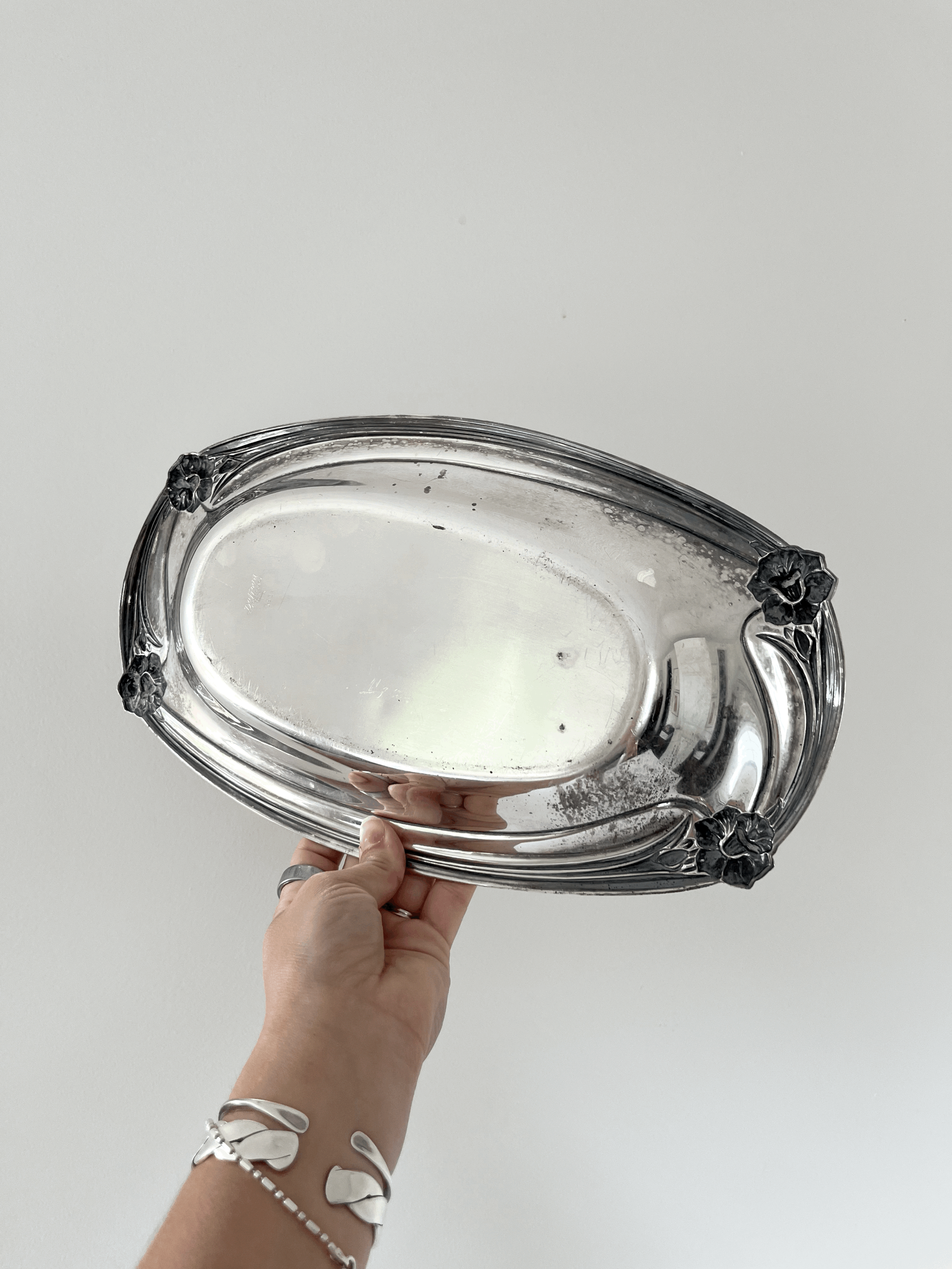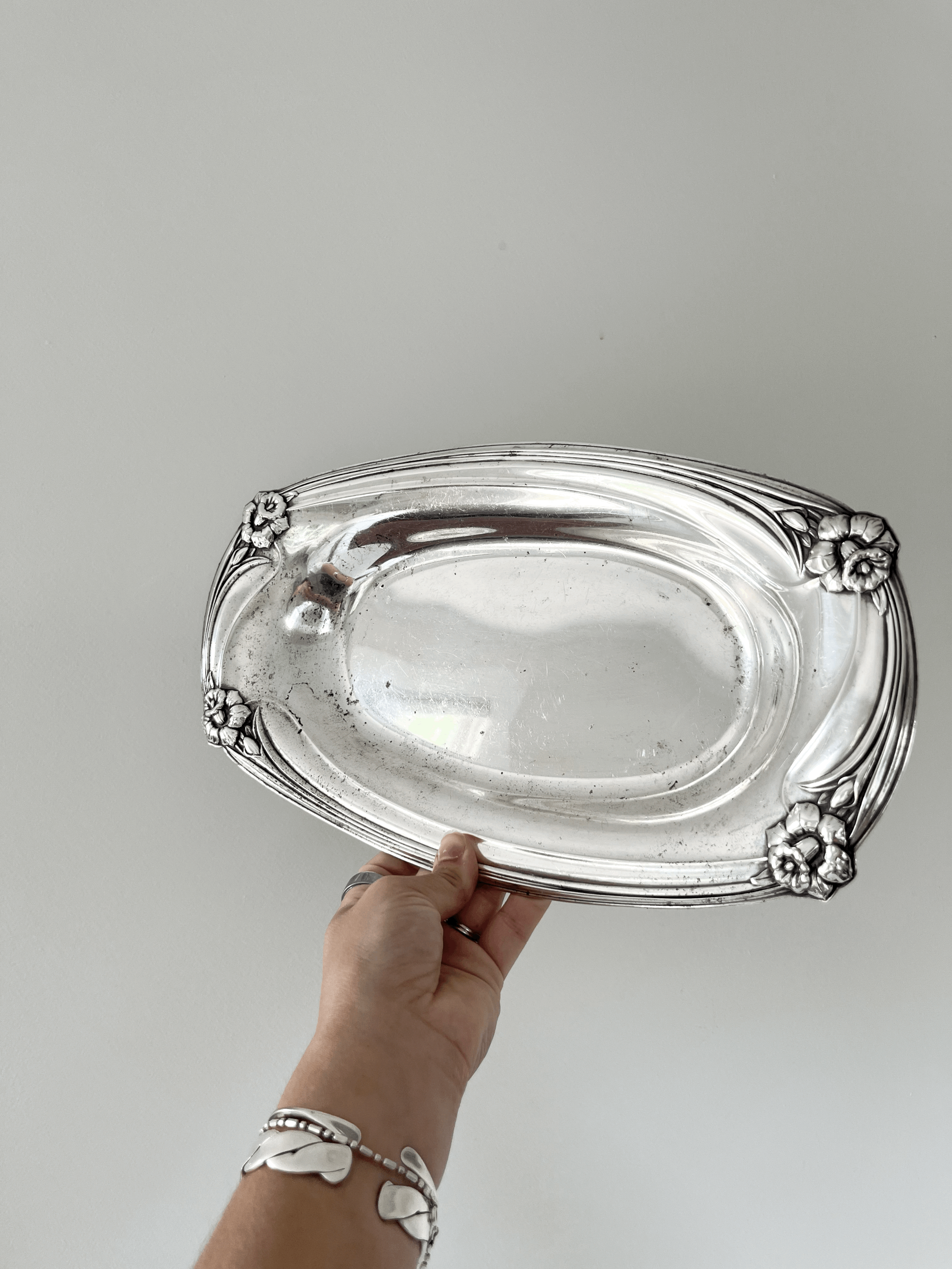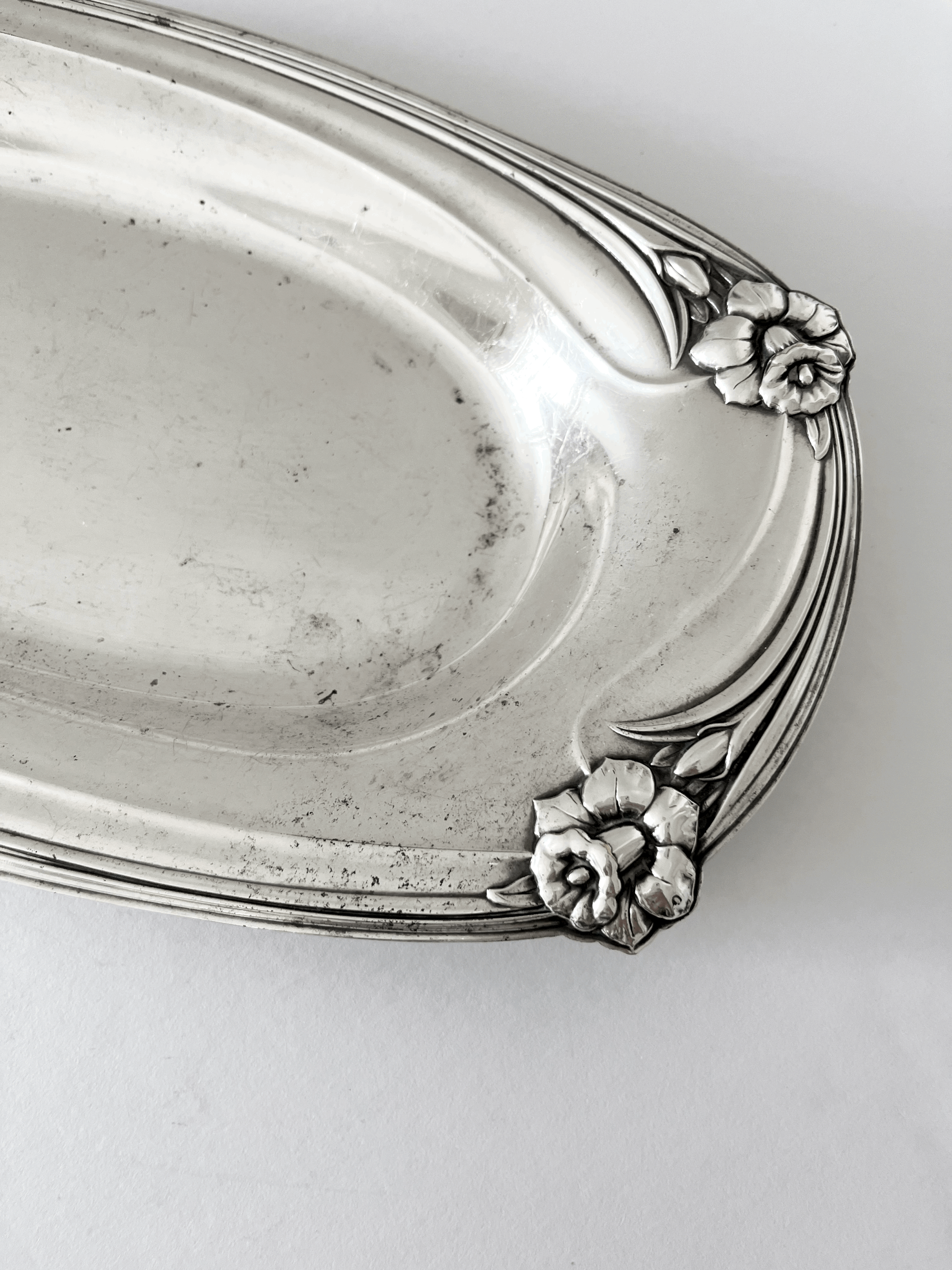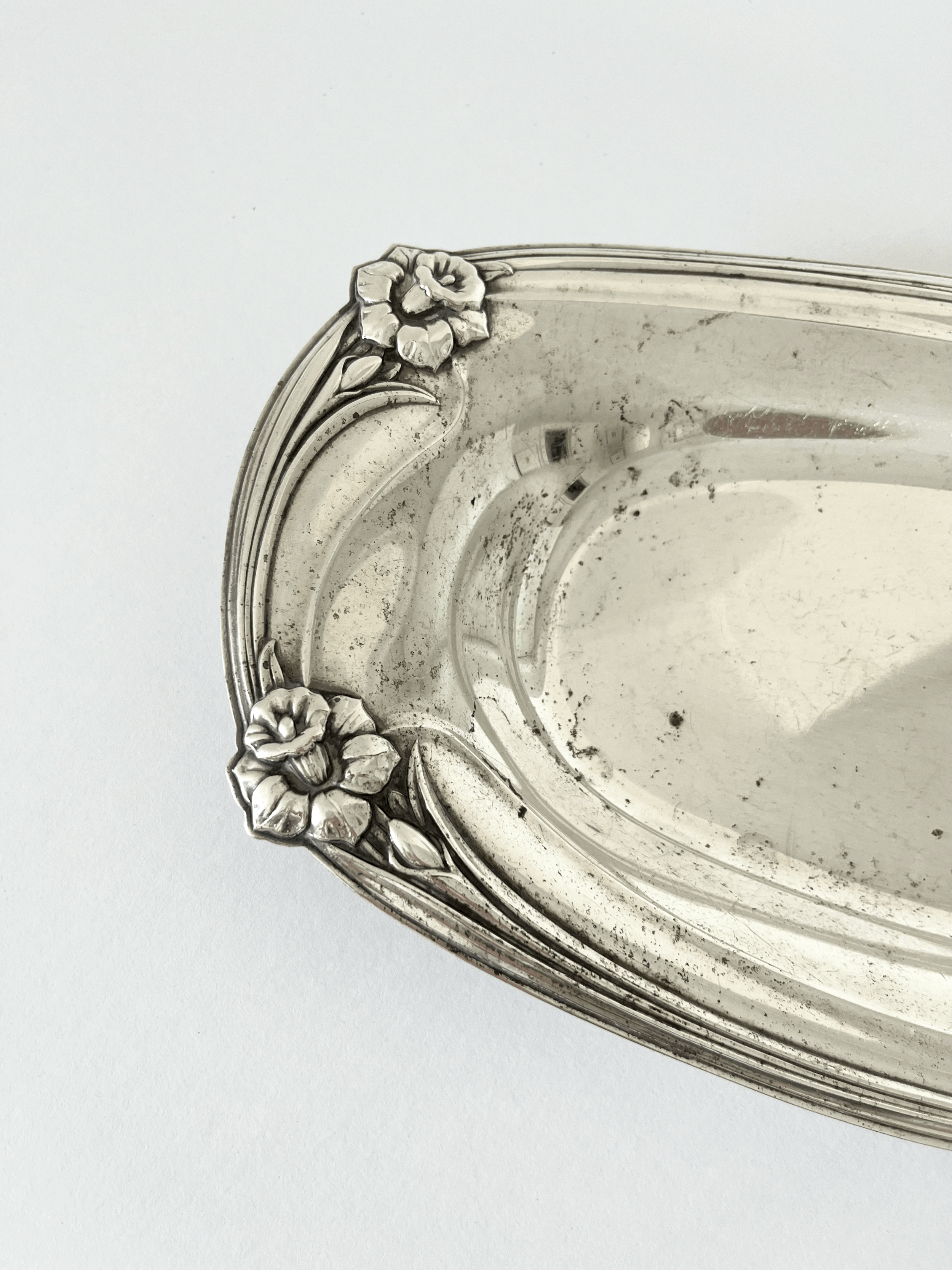 Vintage 1950s silver-plated serving dish by 1847 Rogers Bros, featuring the Daffodil pattern. Art Nouveau-inspired design ideal for serving bread or small items. This piece is in good vintage condition with patina throughout.