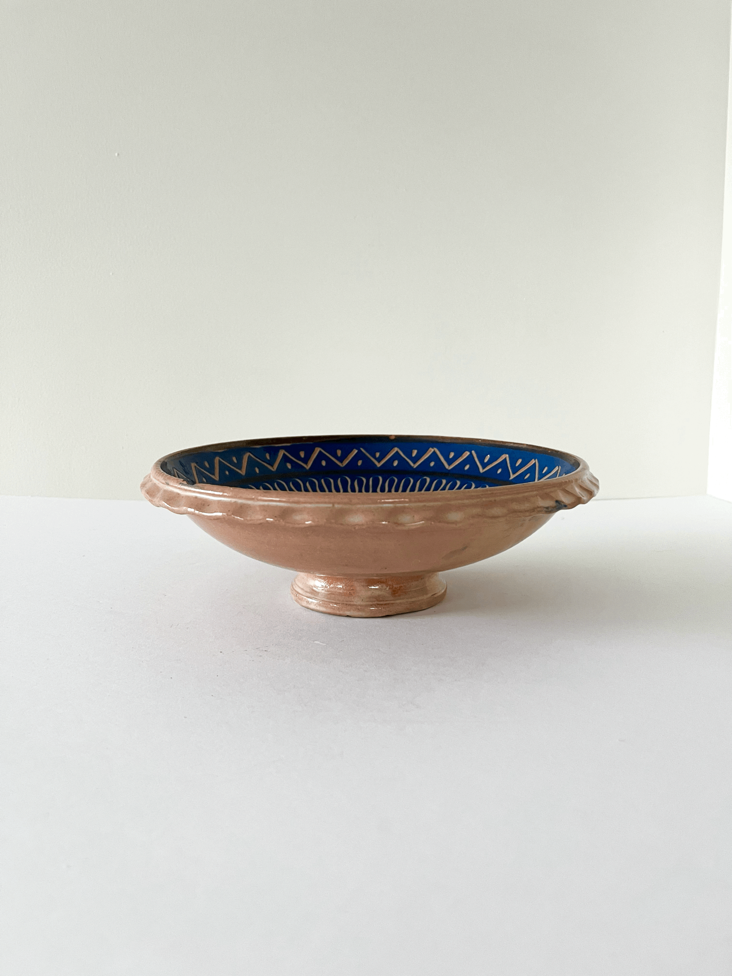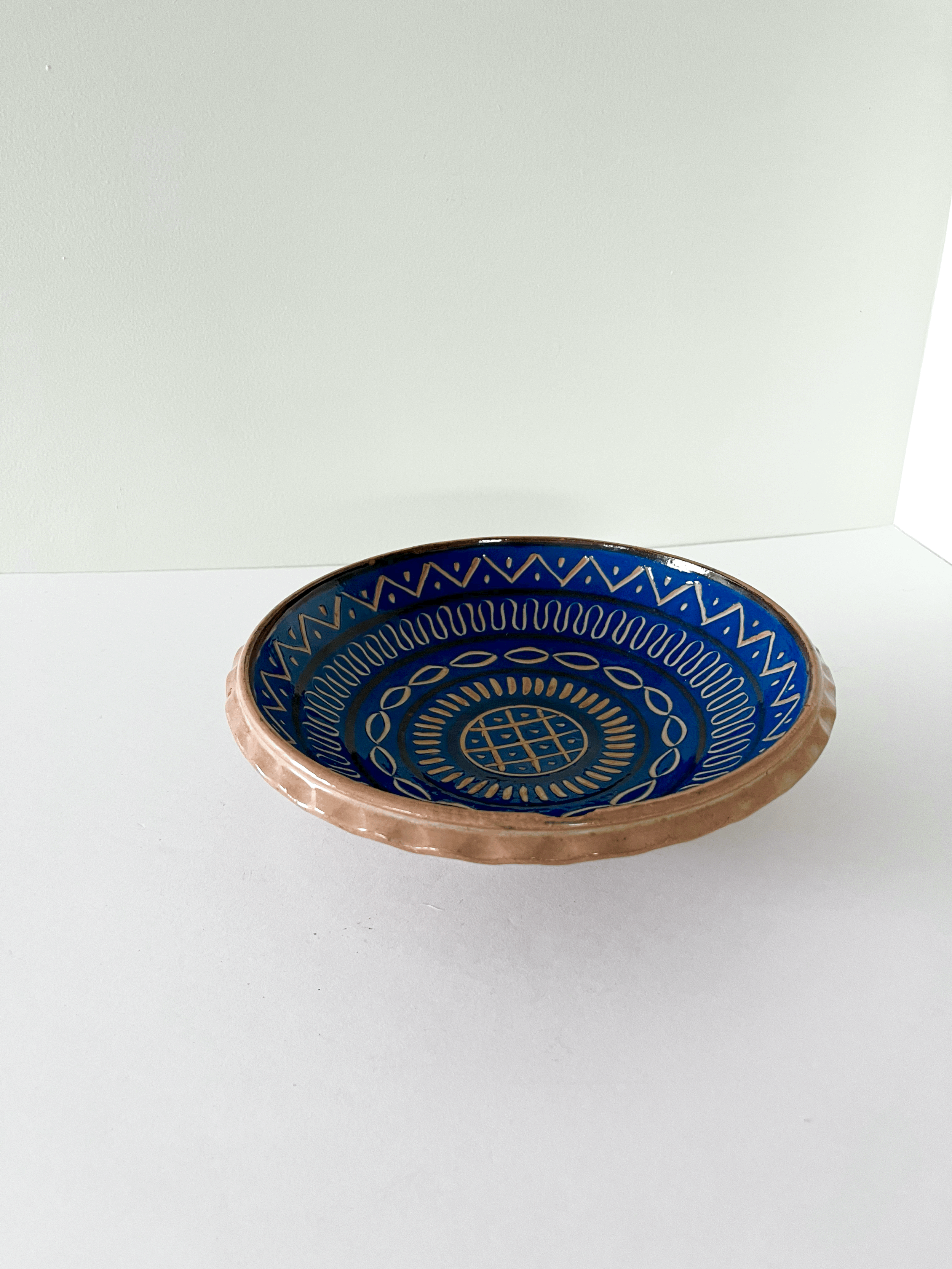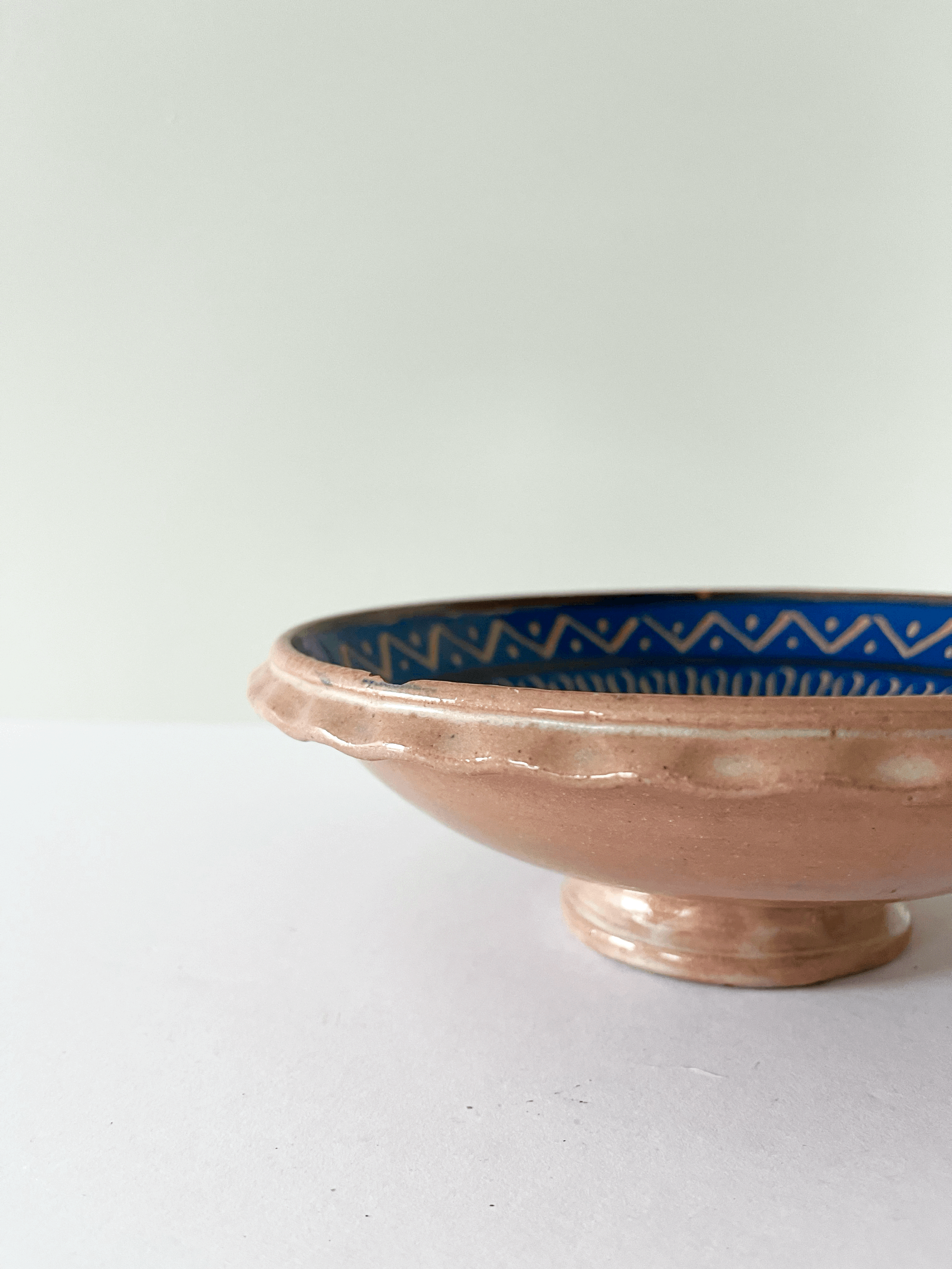 Vintage mini yellowware mixing bowl with blue stripes. Made from earthenware ceramic in a classic striped design. This piece is in good vintage condition.